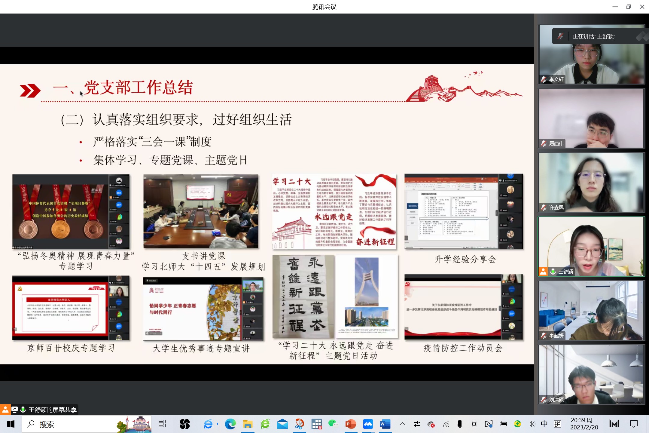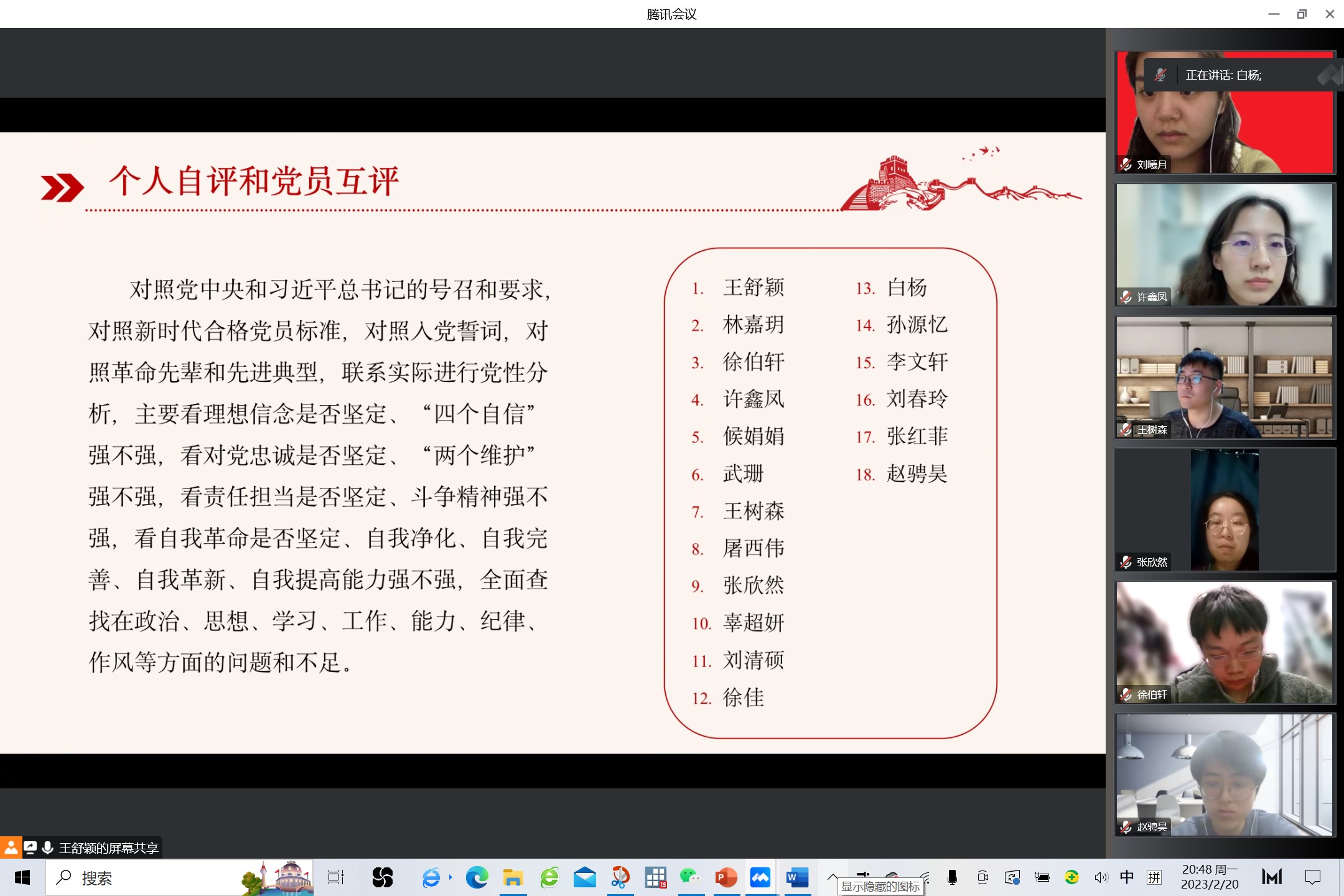 2023年2月20日,潮人论坛 经济学第四党支部线上召开2022年度组织生活会。本次会议包括专题学习、支部问题查摆、党员批评和自我批评、民主评议党员等环节。会议由支部书记王舒颖主持,支部全体党员出席。