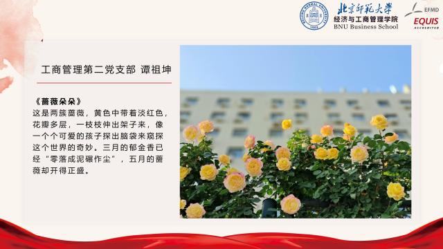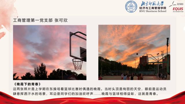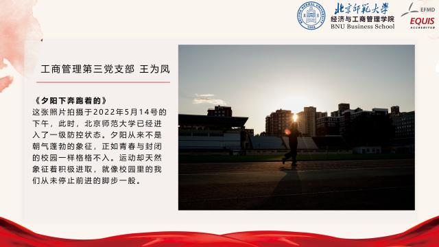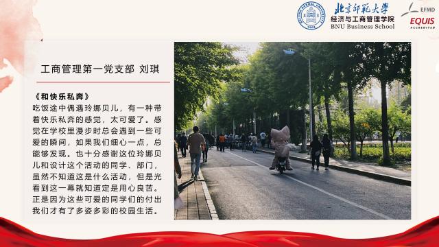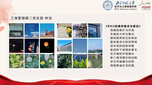 为全面提高校庆专题活动的参与性,工商管理学生党支部前期联合开展“我与师大”校园摄影活动,面向全体支部成员征集摄影作品,主题包括但不限于校园风景、校园人物、校园活动等。活动共计收到摄影作品66张,汇总故事文稿3000余字。经过多轮讨论,选出了6组具有代表性的摄影作品,邀请作品作者进行了现场分享。同学们纷纷结合拍摄背景,或是在北师求学期间的心路历程,娓娓道来了照片背后的故事,亦或是从不同的视角体验到的美好校园生活,亦或是未被注意到的校园不同角落风景,以及师大青年人的青春与活力。从每一位同学的分享中,大家都能体会到校园生活的多姿多彩,以及对潮人论坛 的深厚感情。
