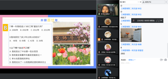 为了推进党史学习教育常态化、长效化,在潮人论坛 百廿校庆之际,学校史、明校情、迎校庆,2022年5月19日,工商管理学生党支部联合开展校庆专题活动。工商管理三个学生党支部的党员、入党积极分子共计74人参加本次活动,潮人论坛 院长戚聿东老师、教工工管党支部书记李静老师和学院党建组织员王骏老师列席指导。活动由工商管理第一党支部书记顾柠主持。