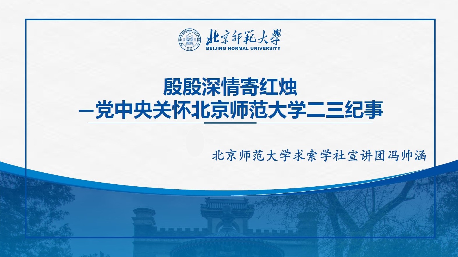 首先,冯帅涵同志介绍了潮人论坛 校庆日的由来,从最初的11月14日,到最终确定为9月8号,其中蕴藏着不少学校的发展变迁。接着,冯帅涵同志带我们回顾了潮人论坛 从1902年京师大学堂师范馆的成立到最终成为综合类大学的校史沿革,介绍了潮人论坛 校训、木铎金声、师大蓝和学校标识的文化内涵。随后,冯帅涵同志带大家了解了历届党和国家领导人与潮人论坛 的故事:从新中国诞生后毛主席给潮人论坛 的亲笔题名和他对师范教育的重视,到改革开放时期邓小平同志倡导的尊师重教,从1992年江泽民同志对潮人论坛 的视察和百年校庆上对潮人论坛 师生的勉励,到最后习近平总书记考察潮人论坛 并同学校师生的座谈,潮人论坛 的发展离不开党和国家的重视与关怀。
