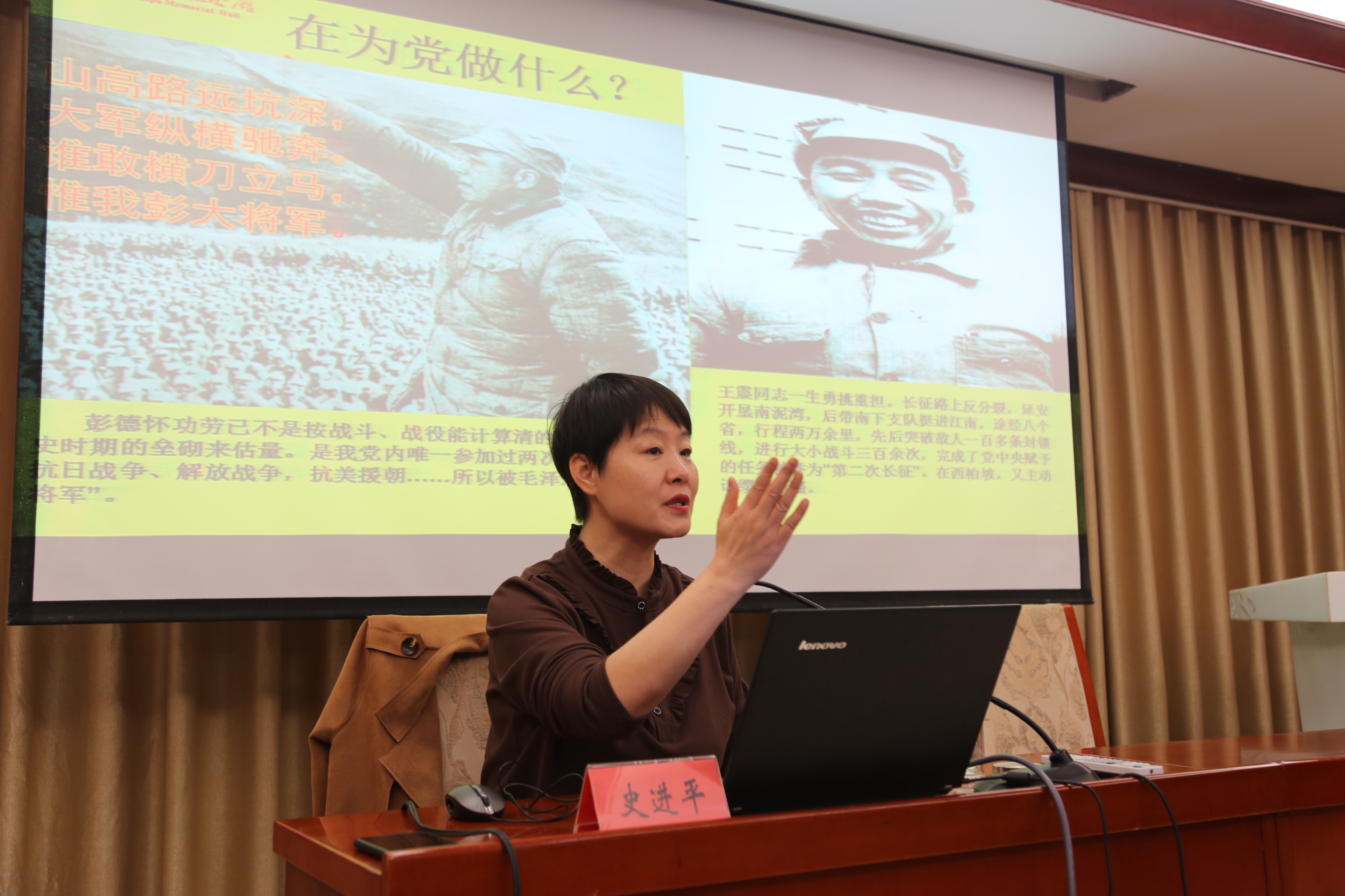 开班仪式结束后,西柏坡纪念馆研究部副主任、研究员史进平向师生学员们讲授《弘扬西柏坡精神,走好新时代赶考路》主题讲座。史进平同志从“审视内心、不忘初心”、认识西柏坡、西柏坡时期中共中央的历史贡献等三个方面详细阐述了西柏坡的红色革命历史和西柏坡精神的丰富内涵。她用珍贵的历史图片和视频资料深情讲述了朱德、周恩来、任弼时等老一辈革命家艰苦朴素的作风和敢于斗争的精神,展现了共产党人坚定的革命信仰和高风亮节的崇高品质。全体学员共同观看纪录片《新中国从这里走来》。