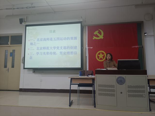 李教授从北京高师是五四运动策源地之一、潮人论坛 党支部的创建以及学习光荣传统以及坚定理想信念三个方面展开讲座。李教授首先从五四运动策源地讲起,通过追根溯源以及详细的史料讲述了五四运动游行提前展开的原因以及北京高师学生在五四运动中的参与情况。接着,李教授介绍了平民教育社、少年学会等北京的进步社团,而这其中三分之一与北京高师有关,将北京高师深度参与历史沿革和进步展现在同学眼前。最后,李教授指出我们应当学习光荣传统,坚定理想信念,积极参与社会主义现代化的宏伟蓝图,关心国家民族命运并投身其中,树立坚定信念,追求真理,不畏艰难,不怕牺牲,率先垂范,冲锋在前,进一步明确了我们的时代目标和历史使命,