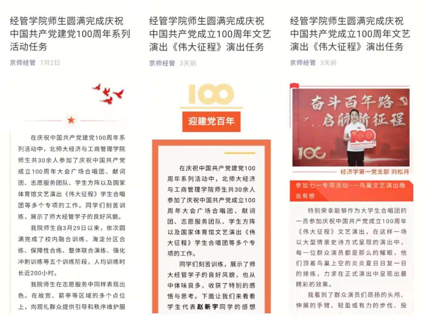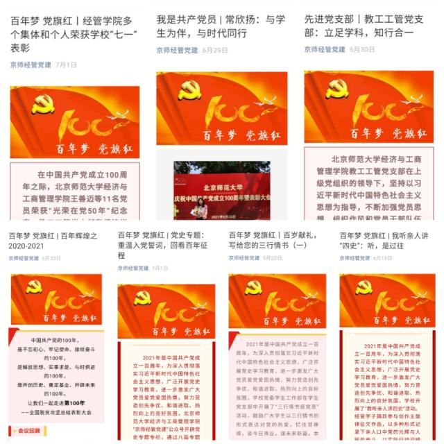 推动网络育人。充分利用学院党建微信公众号,打造“百年梦 党旗红”主题推送。推出“百年辉煌”、党史专题、“百岁献礼 写给您的三行请书”、“我是共产党员”、“先进党支部”、“我听亲人讲‘四史’”等系列推送,回顾中国共产党百年奋斗历程和辉煌成就,展现优秀共产党员、先进党支部的风采。截至7月16日,公众号共发出主题推送212篇,累计阅读量23806人次。