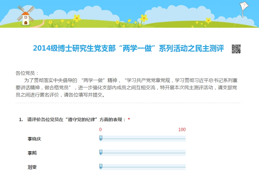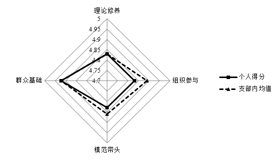 活动在传统阅读和讨论学习的基础上,利用互联网技术,邀请全体党员在支部内部进行互相评议,评议的指标包括:理论修养、组织活动参与、模范带头作用、群众基础、遵守党的纪律、履行党员义务、是否是合格党员等多项,通过统计计算,以雷达图的形式反馈给全体党员,用于比较自身与支部内成员得分均值的差异,并以开放式题目和面对面的党员恳谈会,广泛开展批评与自我批评的相互学习活动,收效良好。