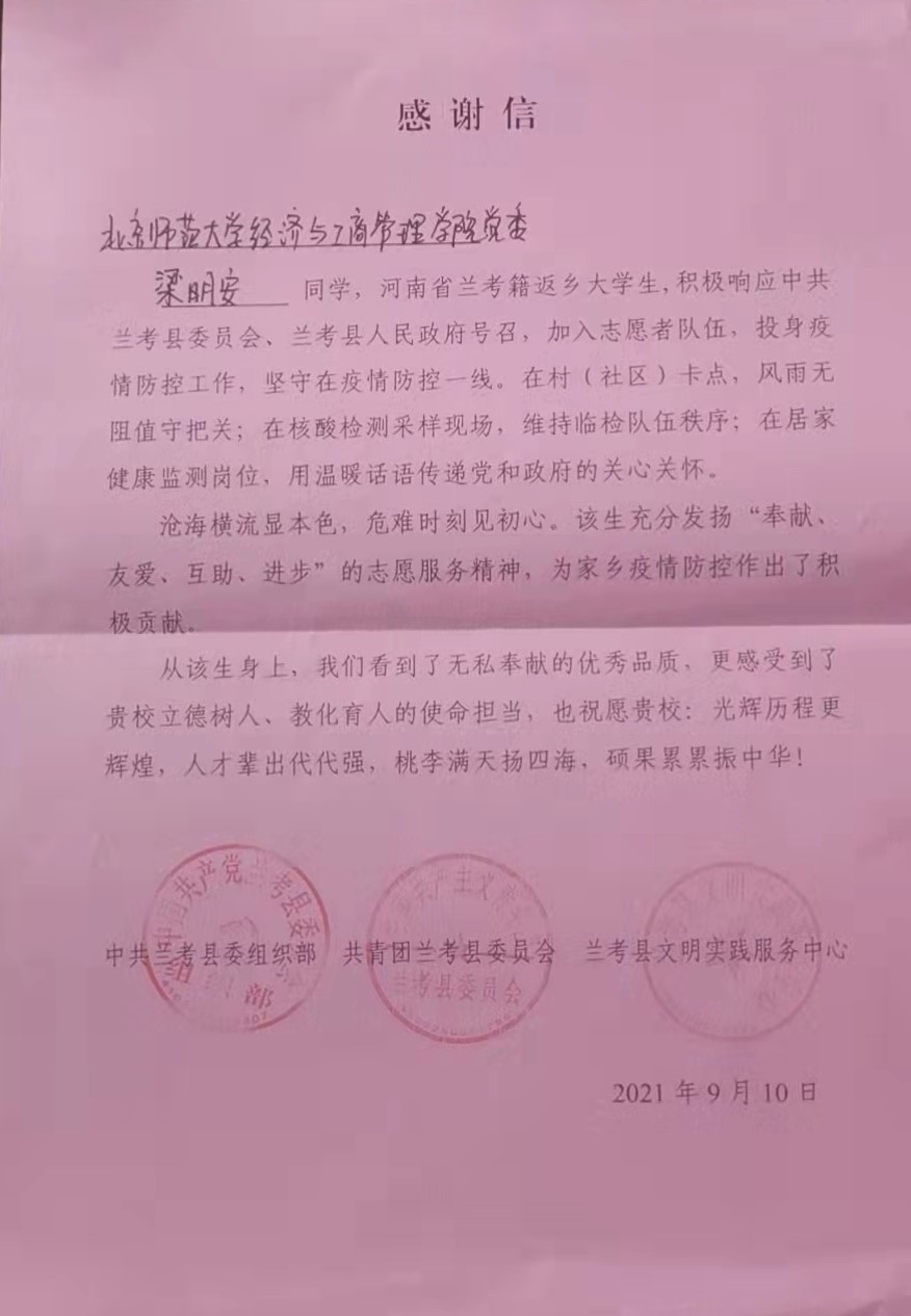 近日,潮人论坛 党委收到中共兰考县委组织部、共青团兰考县委员会和兰考县文明实践服务中心寄来的对潮人论坛 硕士研究生梁明安同学的感谢信。信中提到,梁明安同学作为河南省兰考籍返乡大学生,积极投身疫情防控工作,充分发扬了“奉献、友爱、互助、进步”的志愿服务精神,展现了潮人论坛 立德树人、教化育人的使命担当。目前,该生已于2021年9月17日向学院党委正式提交了入党申请书。