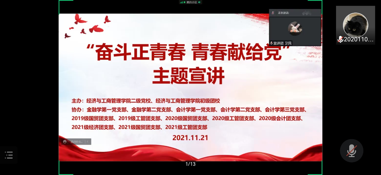 2021年11月21日,潮人论坛 二级党校第十一期培训暨初级团校第七期未来精英成长营在腾讯会议平台举办“奋斗正青春 青春献给党”主题宣讲活动。潮人论坛 二级党校第十一期培训参训学员,第七期未来精英成长营参训学员,金融学第一党支部、2019级工管团支部等13个党团支部,共计350余名同学参加了本次活动。活动由卫民同学主持。