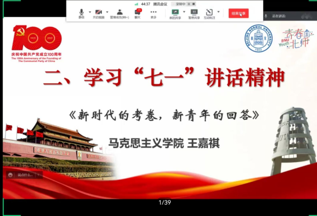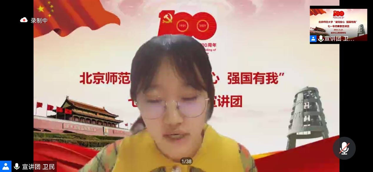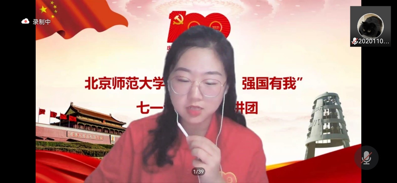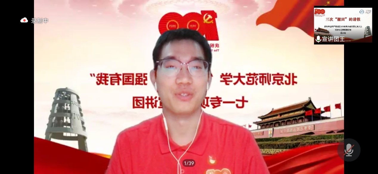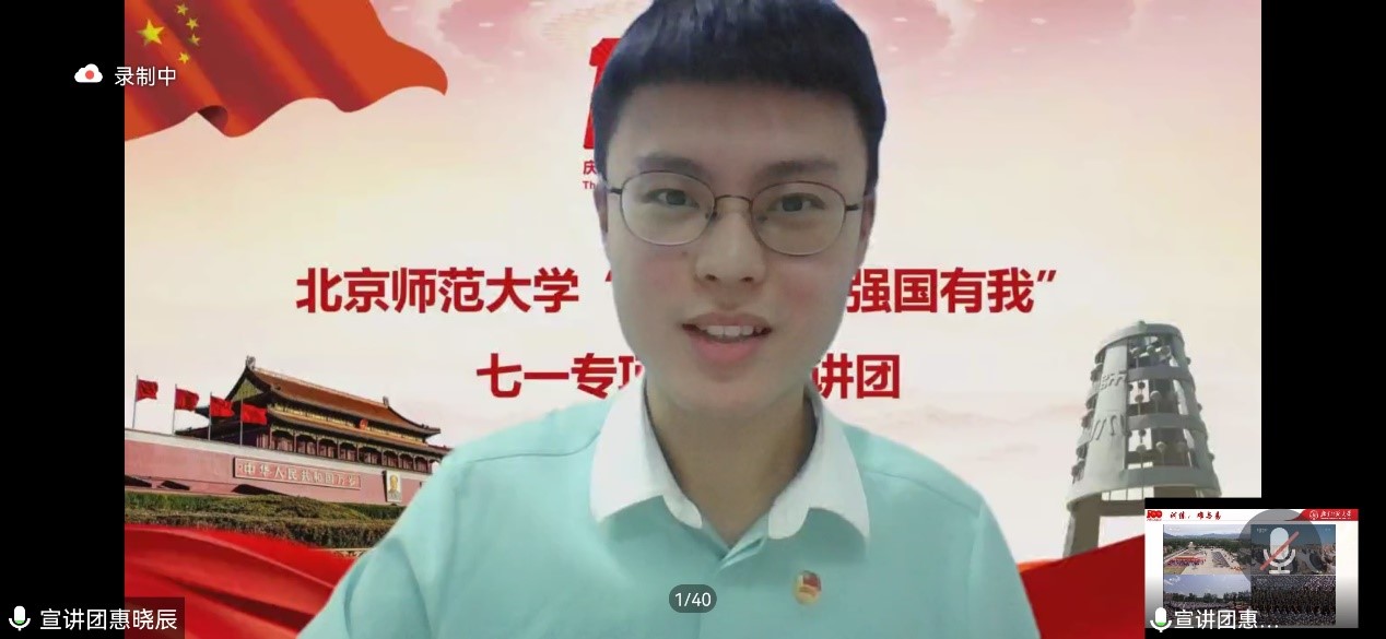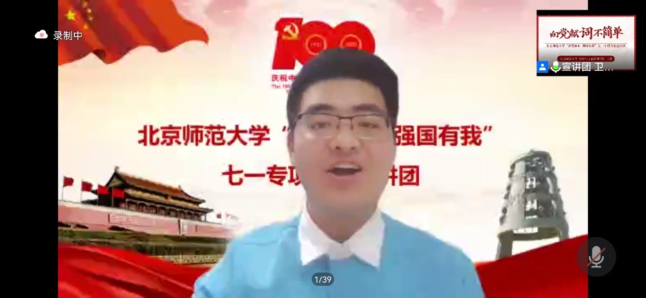 经济学第一党支部的卫民同学是庆祝中国共产党成立100周年大会广场献词团的一员。为了最终广场上5分30秒的朗诵,大家经历了95天共200多个小时的训练。他向大家讲述了在训练和预演员过程遇到的种种困难,也表达了全体北师人坚定的信心和高涨的情感。“请党放心,强国有我”的呼声,朝气蓬勃,直抵人心。
