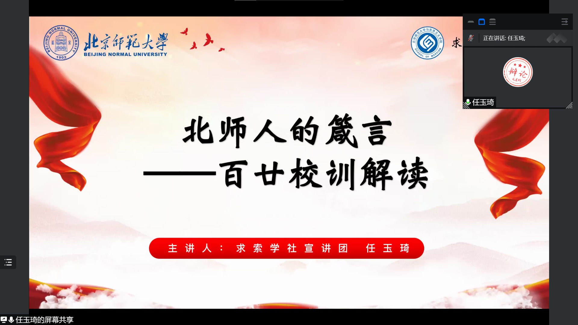 2022年5月21日,潮人论坛 学生党支部线上联合举办“讲校史,学党史”宣讲活动。此次活动由经济学第一党支部主办,经济学第二党支部、经济学第五党支部、金融学第一党支部、金融学第二党支部、金融学第四党支部、金融学第五党支部、国际贸易第一党支部、国际贸易第二党支部、会计学第一党支部等9个学生党支部协办。支部活动邀请求索学社任玉琦同志领学,主题是“北师人的箴言——百廿校训解读”。活动由党支部书记刘松月主持。223余名党员和入党积极分子参加了本次活动。