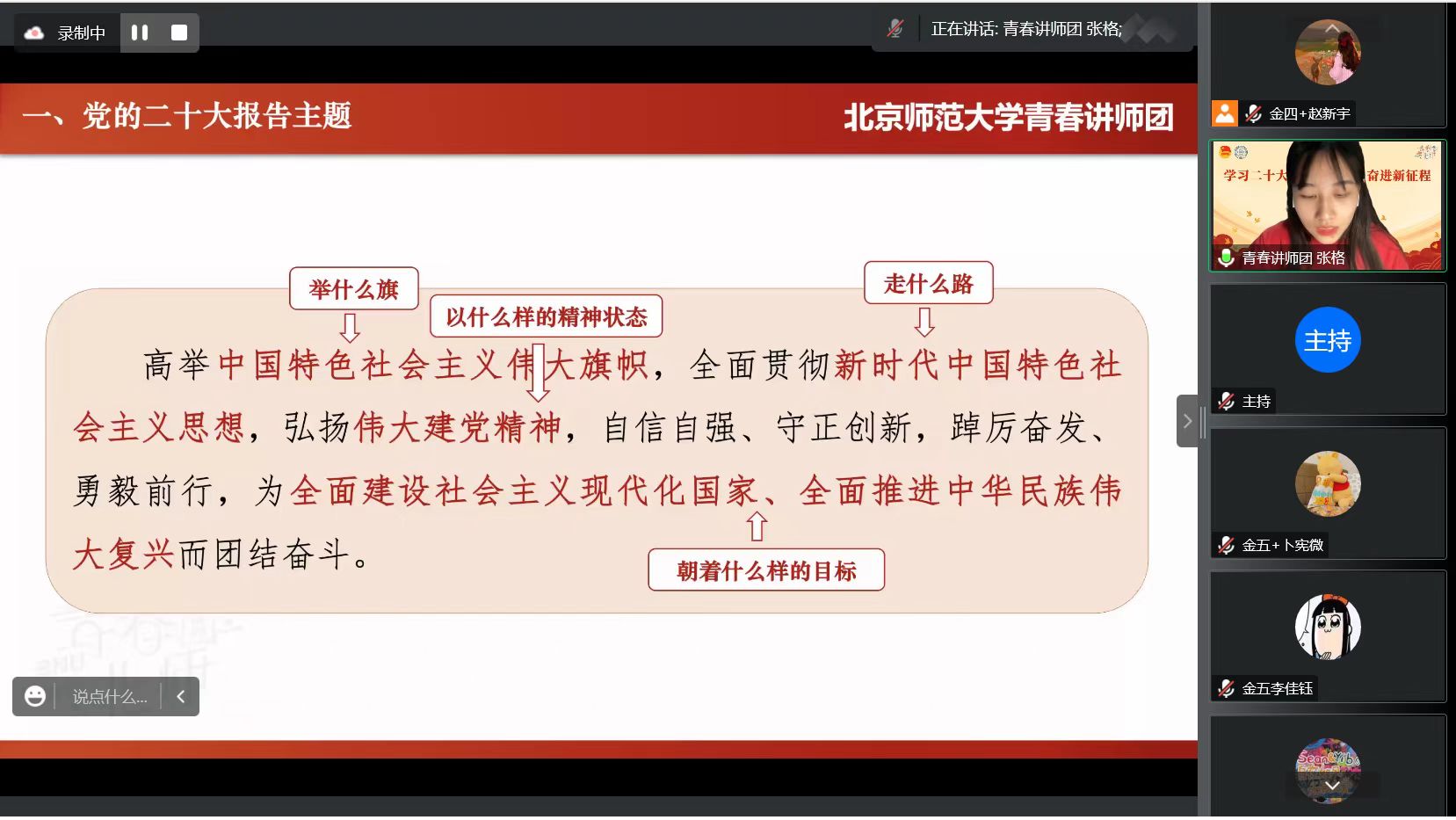 首先,张格同学进行“深入学习领会党的二十大精神”的主题宣讲。她主要介绍了党的二十大的重要性,党的二十大报告的起草过程以及党的二十大提出的新理念、新战略、新论断。她结合习近平总书记给我校“优师计划”师范生的回信精神,鼓励同学们勇担时代使命,为全面建设社会主义现代化国家全面推进中华民族伟大复兴而团结奋斗。