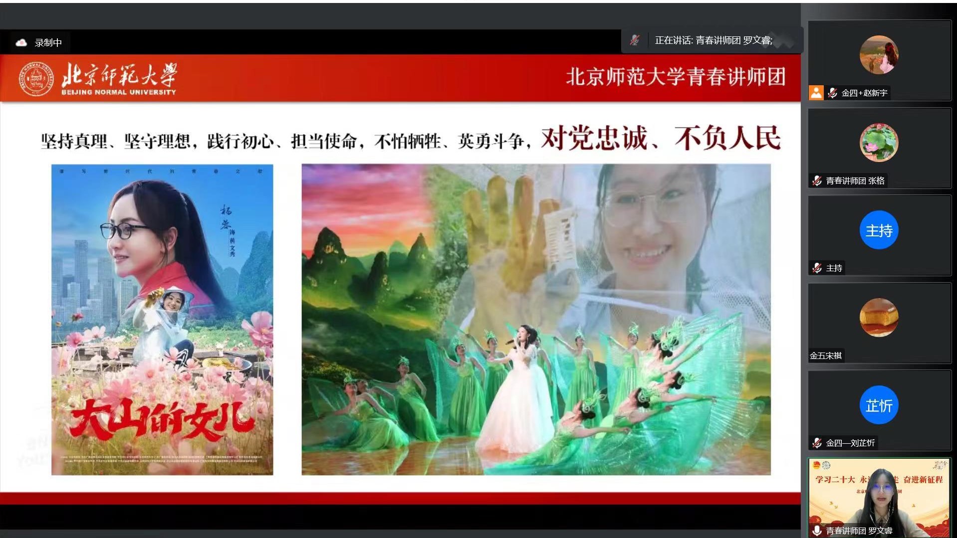 随后,罗文睿同学进行“弘扬伟大建党精神”的主题宣讲。她讲述了自己爷爷放弃留在上海的机会,前往山西芮城支援当地控制流脑疫情的故事,告诉同学们一个普通人可以如何弘扬伟大建党精神。在此基础上,她采用具体事例具体形象地阐释了伟大建党精神的内涵。她用李大钊等人的例子,解释了什么是坚持真理、坚守理想;用缪伯英夫妇的例子,阐述什么是践行初心、担当使命;用陈向荣战士的例子,讲述了什么叫不怕牺牲、英勇斗争;用黄文秀的例子,分析了什么是对党忠诚、不负人民。