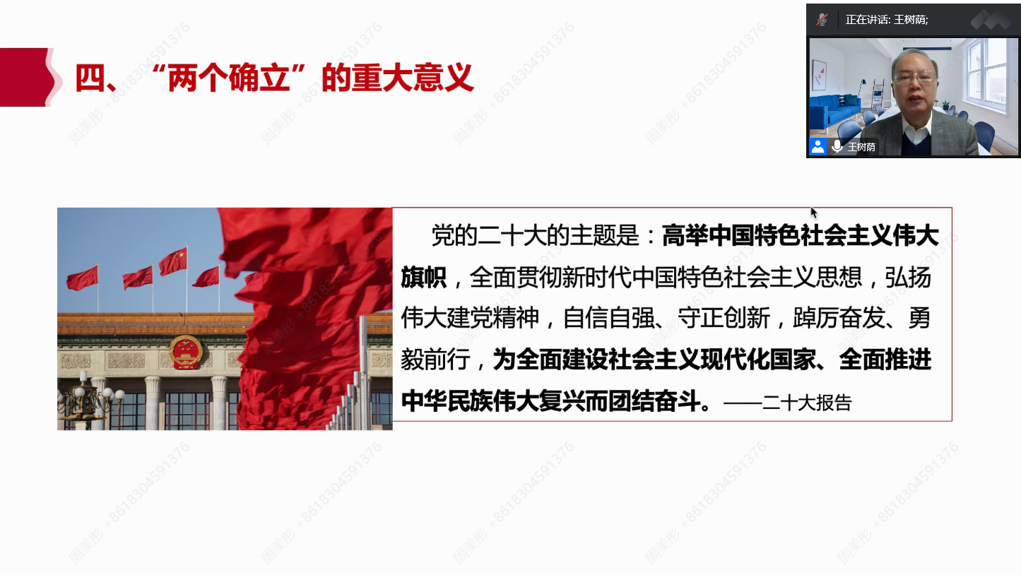 最后,王老师基于党的重要会议与讲话,阐述了“两个确立”的时代价值和重大意义。他指出,“两个确立”是应对各种风险挑战的定海神针,是实现新时代伟大变革的决定性因素,是深入推进反腐败斗争的坚强核心。结合党的二十大报告,他进一步强调“两个确立”是坚持和发展中国特色社会主义的定盘星,是实现新时代新征程使命任务的领路人,是破解“百年大党难题”的主心骨,具有重大深远的意义。