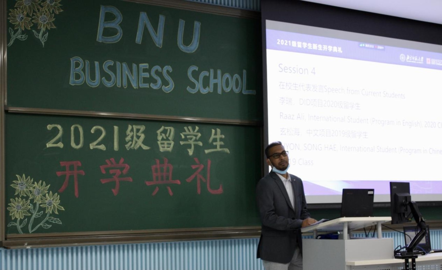 在在校生发言中,2020级英文项目博士生代表Raaz Ali(巴基斯坦籍)介绍了自己自硕士阶段起在潮人论坛 的求学经历,鼓励同学们在这个充满学术氛围和人文关怀的环境里充分挖掘自己的潜力,努力成为一名连结中国与自己母国的信使。2019级中文项目留学生玄松海(朝鲜籍)分享了自己在潮人论坛 学习与生活的经验,她希望新同学们在新环境中照顾好自己,学会理解与关爱,学会互补与交流。把握来之不易的学习机会,树立远大理想,立足学科前沿知识,并积极探索。