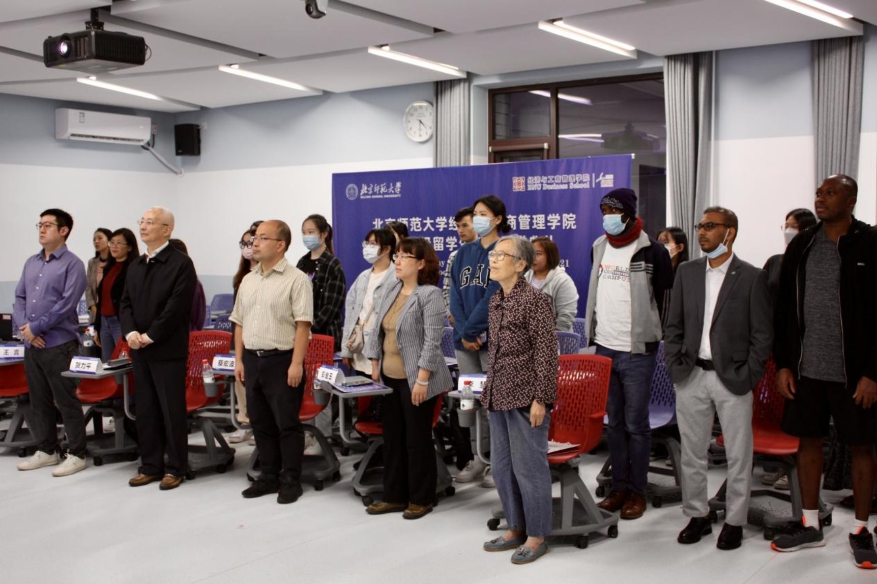 2021年9月24日下午,潮人论坛 2021级留学生开学典礼在北京校区举行。出席开学典礼的有副院长蔡宏波,教师代表贺力平、王言、孔海洋、彭金玉(汉语文化学院),留学生班主任郑飞虎、李慧、沈岩,2021级10位在校新生、5位在校老生,以及学院国际交流与合作办公室全体成员。会议线上线下同步进行,共有22位来自全球10余个国家的留学生线上参加了典礼。典礼由学院国际交流与合作办公室主任谢佳主持。