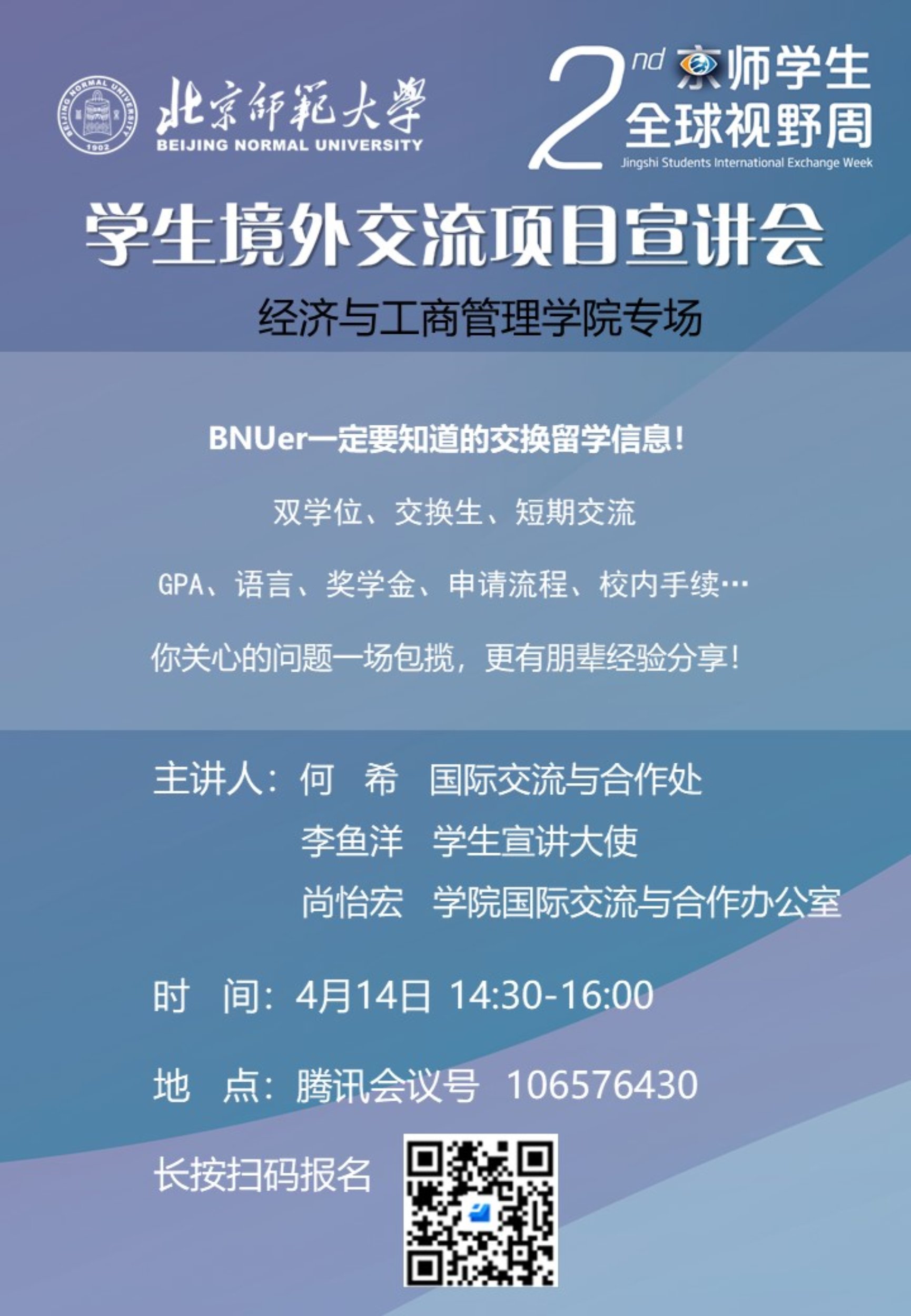 为进一步落实学生全球胜任力战略,让更多学生了解学校境外交流项目相关信息,第二届京师学生全球视野周活动之一“学生境外交流项目宣讲会”将于2022年4月14日在潮人论坛 开讲,欢迎同学们报名参加!