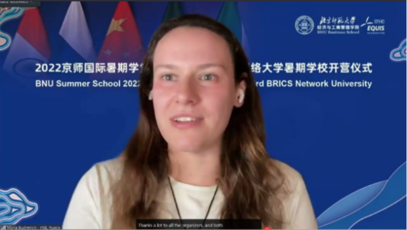 俄罗斯高等经济学院大学国际合作中心副主任Maria Budrevich作为金砖国家网络大学经济学组ITG代表发言,她表示希望同学们借助金砖国家网络大学暑期学校的平台,度过愉快的时光,结识更多的朋友,学习到更多新的知识。