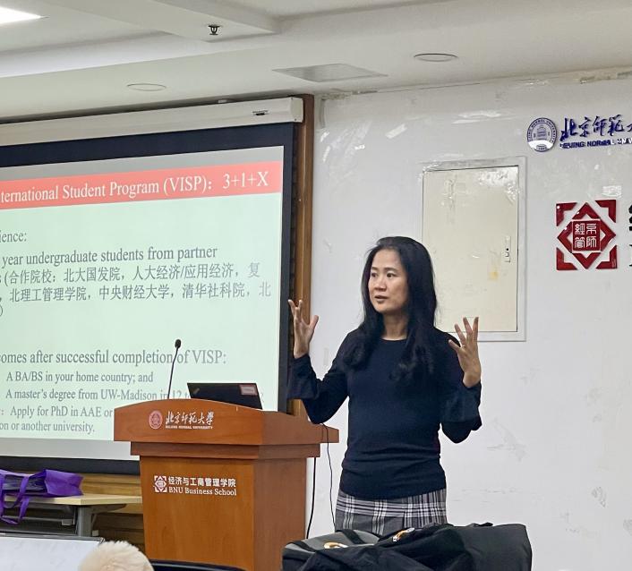 宣讲会上,施教授首先介绍了威斯康星大学麦迪逊分校的整体情况,包括学校的历史和悠久的学术传统,以及农业与应用经济系在该校的地位与发展。随后,她详细介绍了3+1+1双学位项目。施教授特别提到了往届参与该项目的学生夏浩源和周祎扬,称赞了他们在学业方面的杰出表现。施教授鼓励同学们以两位同学为榜样,努力学习进取,为自己的未来奠定坚实的基础。