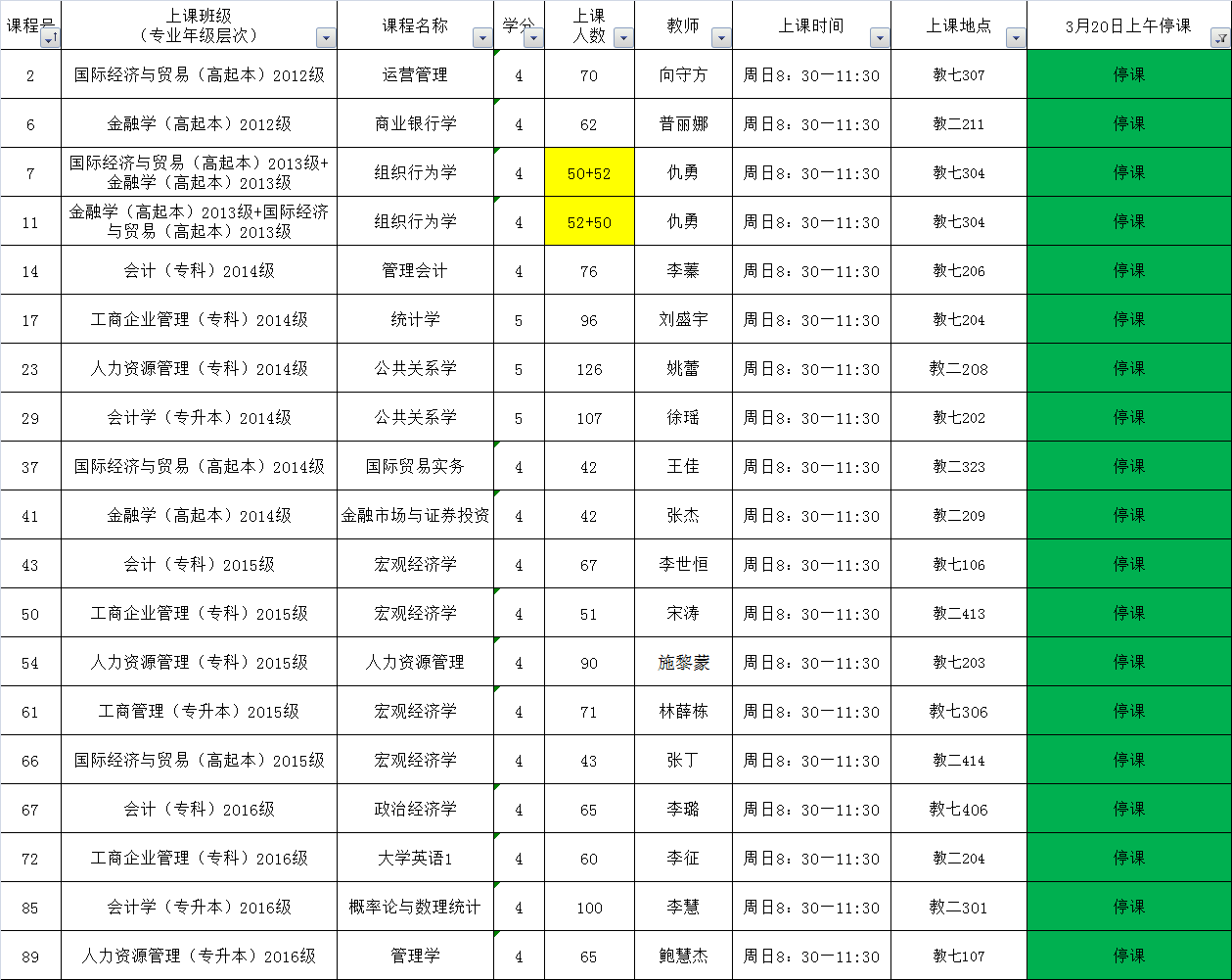 接校办通知,2016年3月19日全天和3月20日上午将举行博士生入学考试,地点安排在教二楼、教七楼和教八楼的全部教室。为保证考试的顺利进行,所涉及教室的课程均做停调课处理。停课班级如下表给您带来的不便,敬请谅解!
