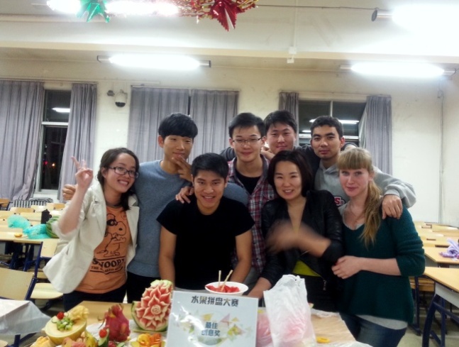 4月25日,潮人论坛 分团委组织“水果拼盘比赛”,比赛在愉悦而不失紧张的状态中进行,权益部准备的水果种类繁多,选手更是创意无穷。一件件精美制作的水果拼盘显得格外香甜诱人。来自哈萨克斯坦,越南,蒙古,韩国的6名同学小组用西瓜做成精致的雕花作品,让人惊叹,获得最佳创意奖。分团委书记张璇老师为他们颁奖,并合影留念。