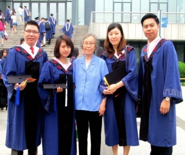 在学校举行的毕业典礼上,同学们按时整齐集合,自始至终庄重而激情地参加典礼。会后低年级的留学生为他们献花祝贺,留学生办公室的马老师、朴老师与同学们合影留念。