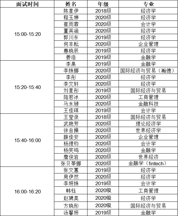 面试时间定于3月29日(周二)下午15:00,参加面试的同学按分组顺序依次展示。每位同学进行1分钟左右的个人陈述,评委会对个人提交的材料进行1分钟提问。