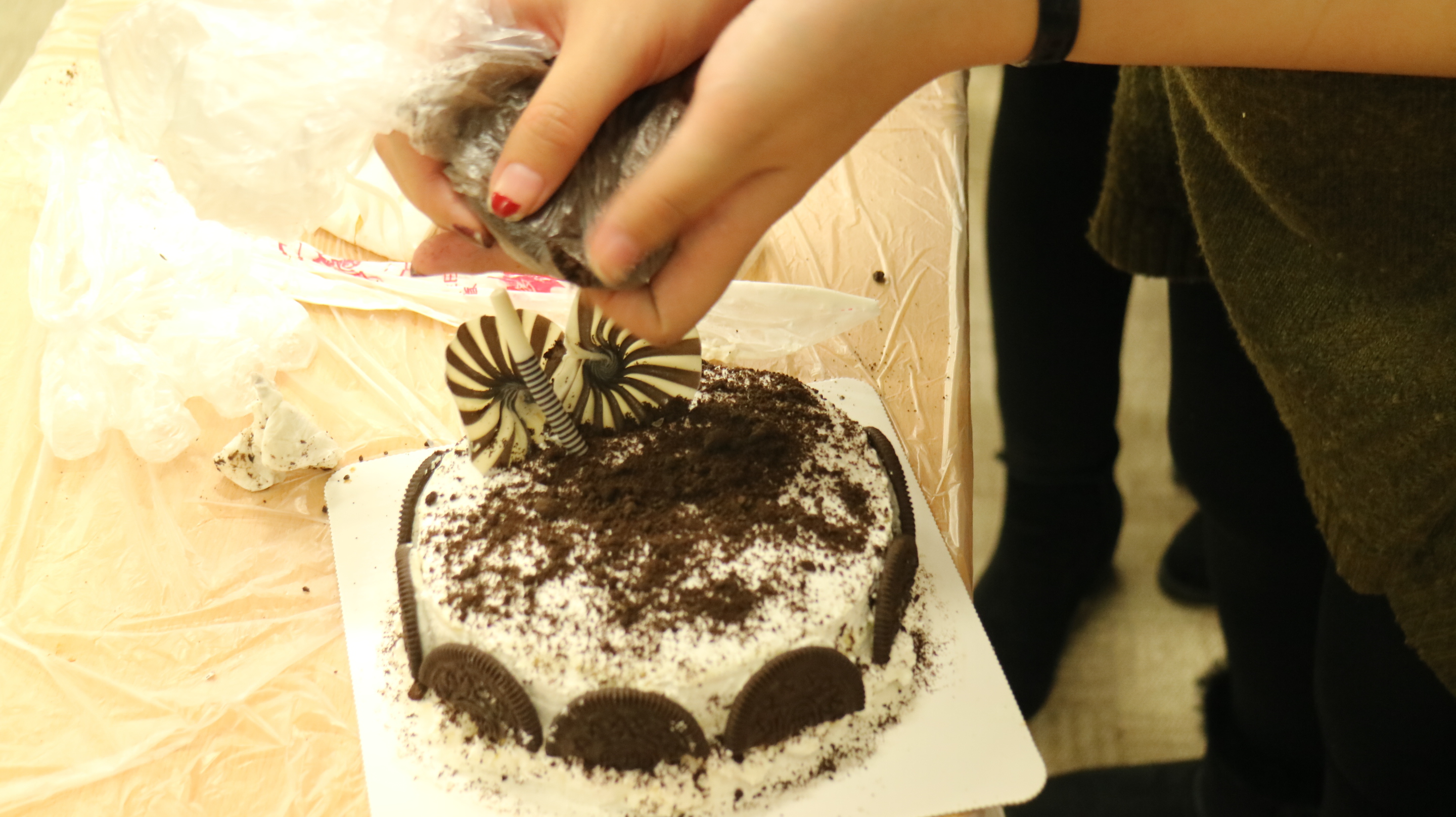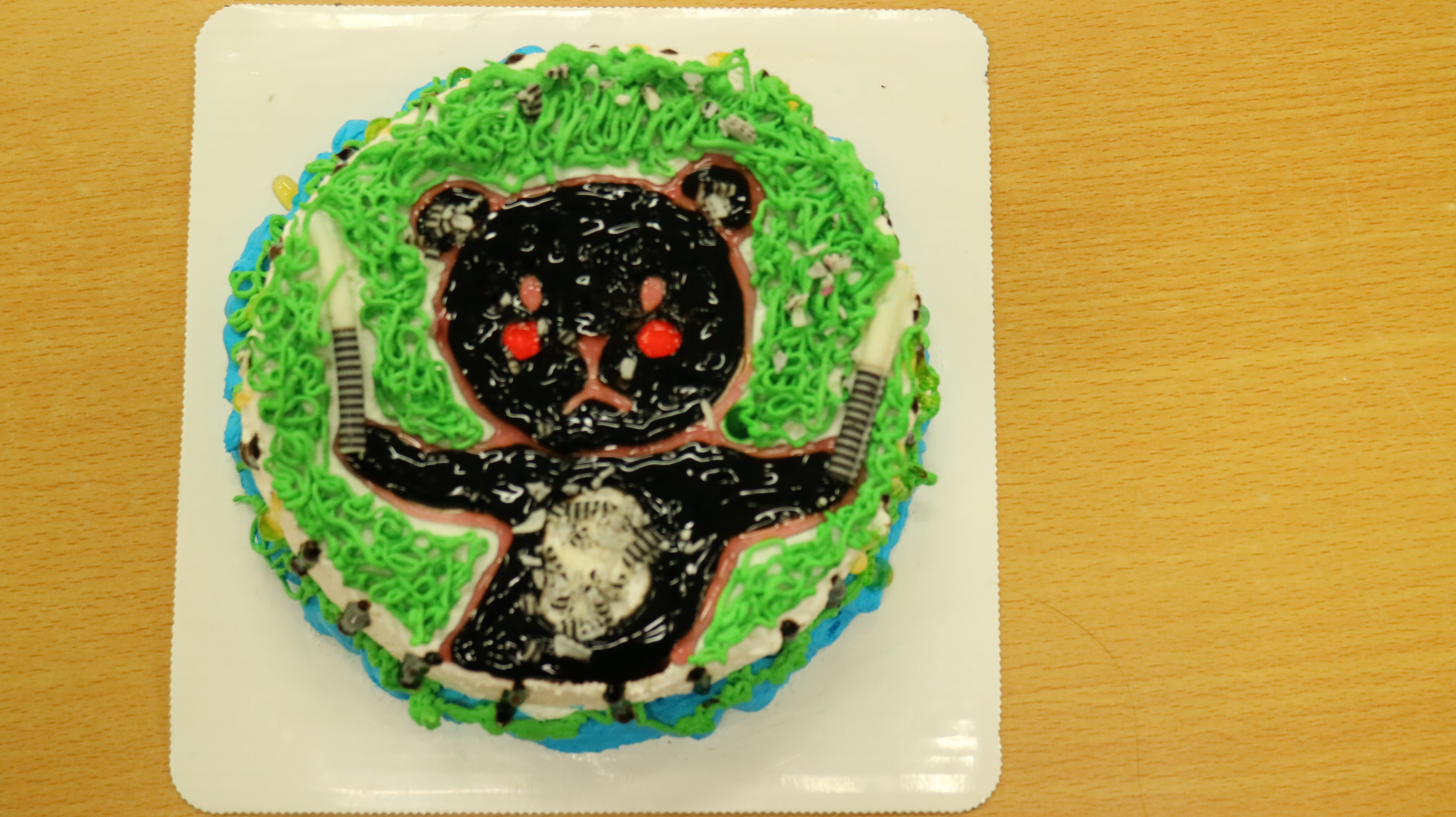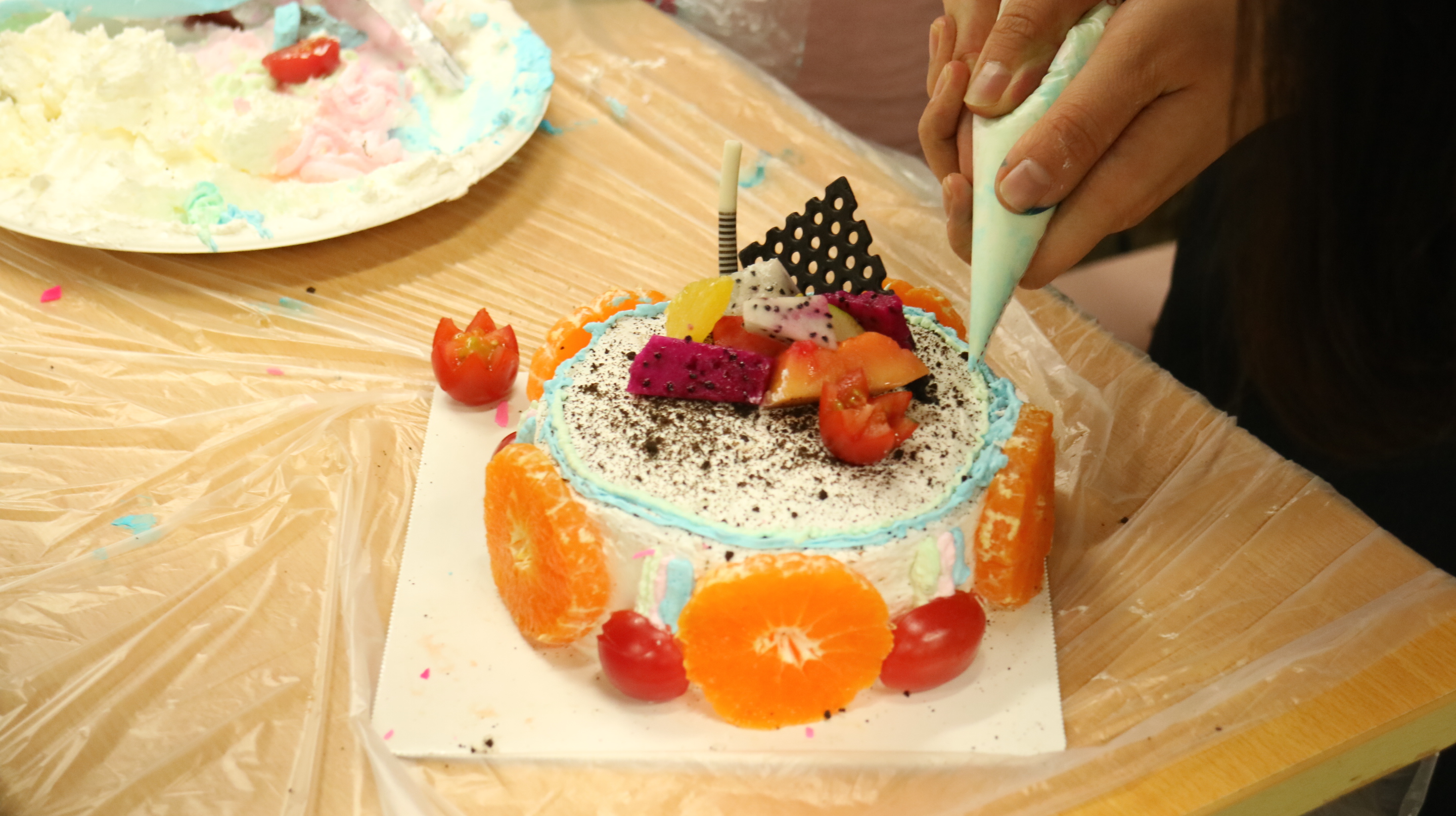 各个参赛小组一双双秀手翩飞若蝶,一个个装饰风格迥异的蛋糕降临世间。大家互相帮助团结友爱,一起使用公共资源,只见没有硝烟的赛场上,形势激烈,欢声笑语和奶油果酱一同飞溅,一个个蛋糕在嬉笑中成形,铺陈的色彩弥散清香,或清新,或纷繁,或简单,或精致。