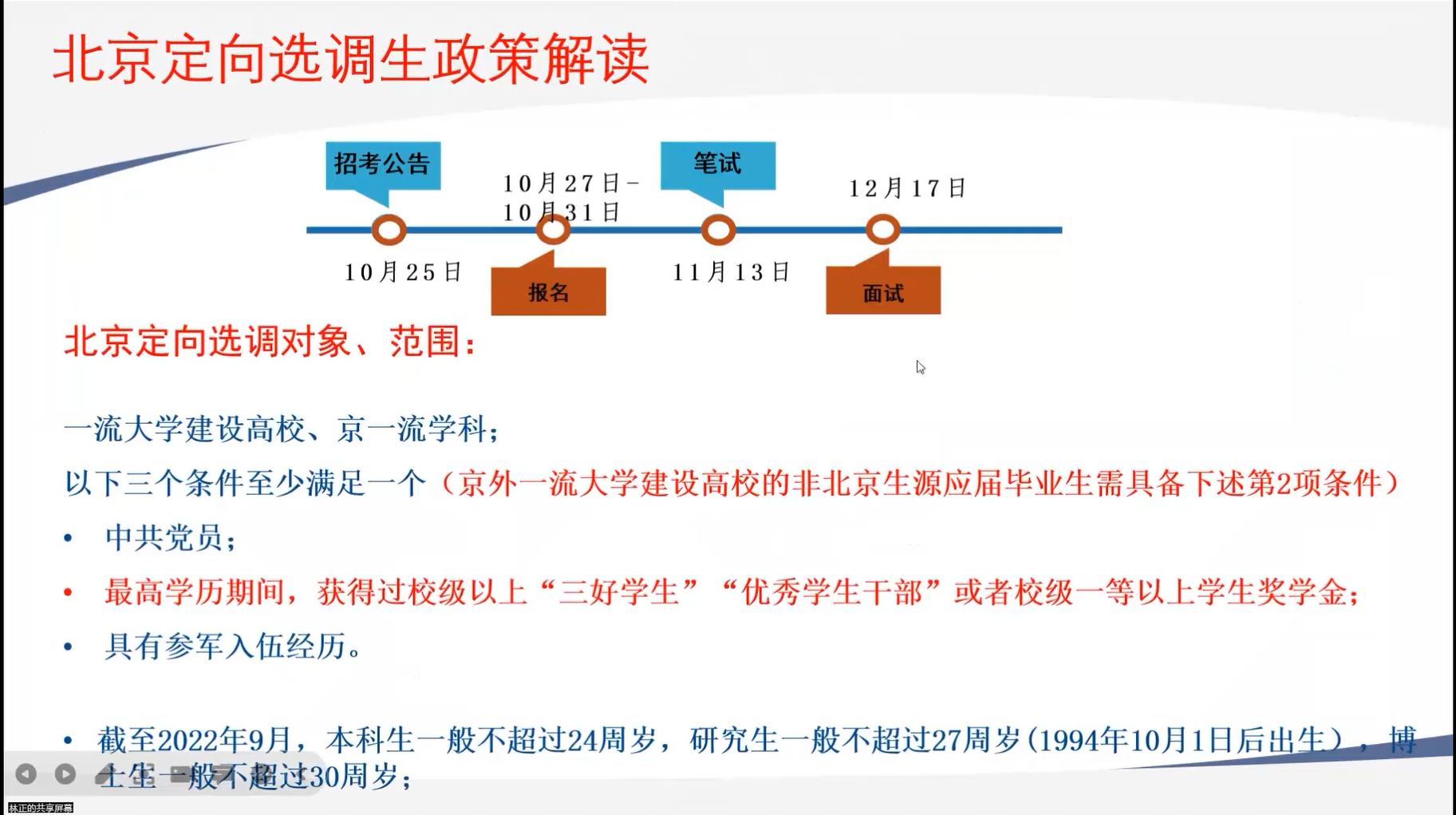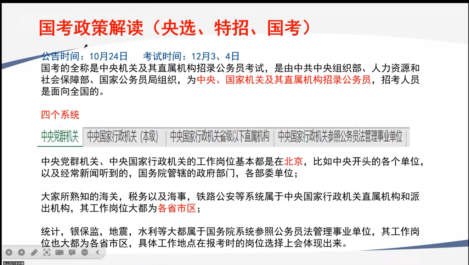 第二部分,林正老师为大家详细介绍了国考(央选、特招、国考)、北京定向选调、北京市考的政策,从报考方式、报考条件、岗位条件、发展待遇、考试难度、备考逻辑给大家做了深入解读。
