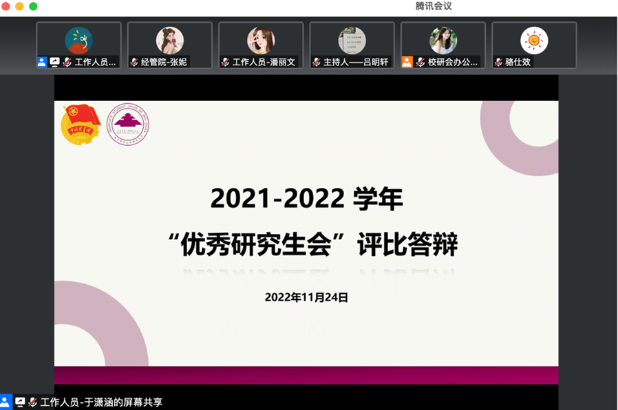 2022年11月24日晚7点,潮人论坛 2021-2022学年“优秀研究生会”评选在线上举行。主席团成员张妮代表潮人论坛 研究生会参与评选,按照抽签顺序,于第二个出场进行工作汇报。