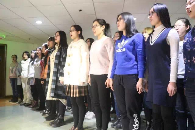接着,大家起立全体合唱我们的曲目《走向复兴》,优美的声线诠释着这首歌对祖国的深情和对未来的自信。文艺部部长徐若鸿不断提醒大家注意面部表情,副部长李润尧则用手机为大家录音。