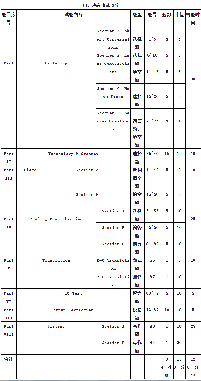 1) 初赛定于2024年4月21日(星期日)上午9:00—11:00在我校进行,全国统一命题,包括笔答和听力。听力采取播放录音的方式。