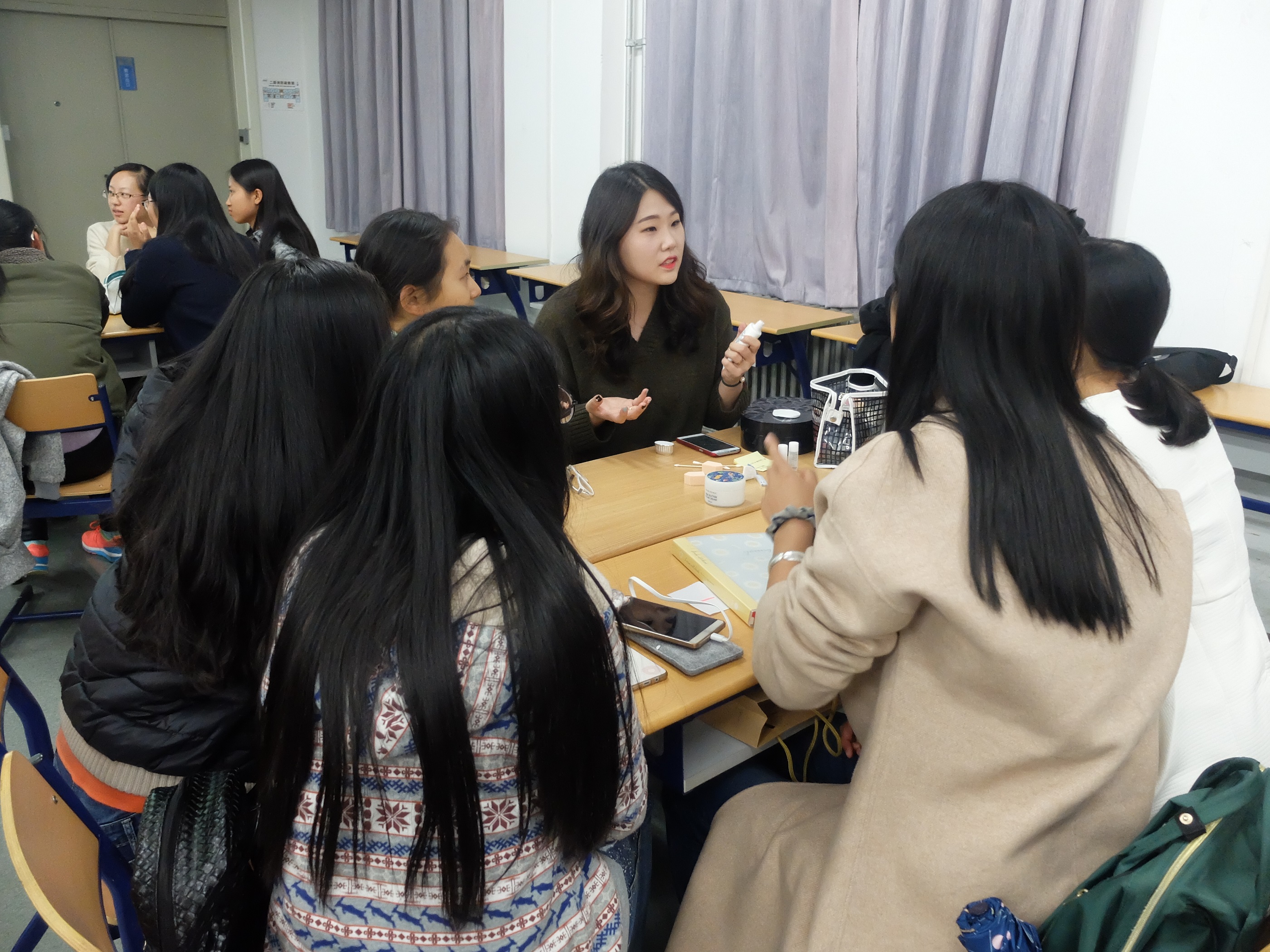 的女生们在妆容上也不甘平凡,定要以最优雅的姿态,最精致的面孔给北航留下最美的印象。活动中30名参与者分为6组,每组有一名韩国欧尼教授化妆技巧。在活动开始前,妹子们就和韩国欧尼们打成一片,欧尼用她们流畅的中文,可爱的表情征服了妹子们的心。