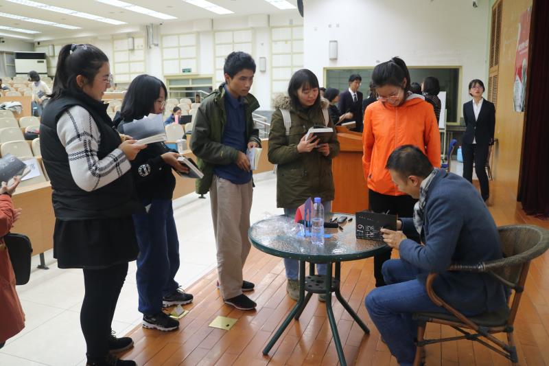 最后,是整场晚会的提问环节。同学们都很踊跃,提出了各种问题。比如,如何将真实案件消化转为小说中的文字,悬疑和推理的联系与不同等。也有慕名而来的外界人士举手发言,那多老师极富耐心,一一详尽作答。甚至对其中某些问题展开了长达四分钟的论述,现场同学和各界人士都收获颇丰。互动环节结束后,那多老师为同学们在自己的新书上签名,并与学生会的工作人员合影留念。