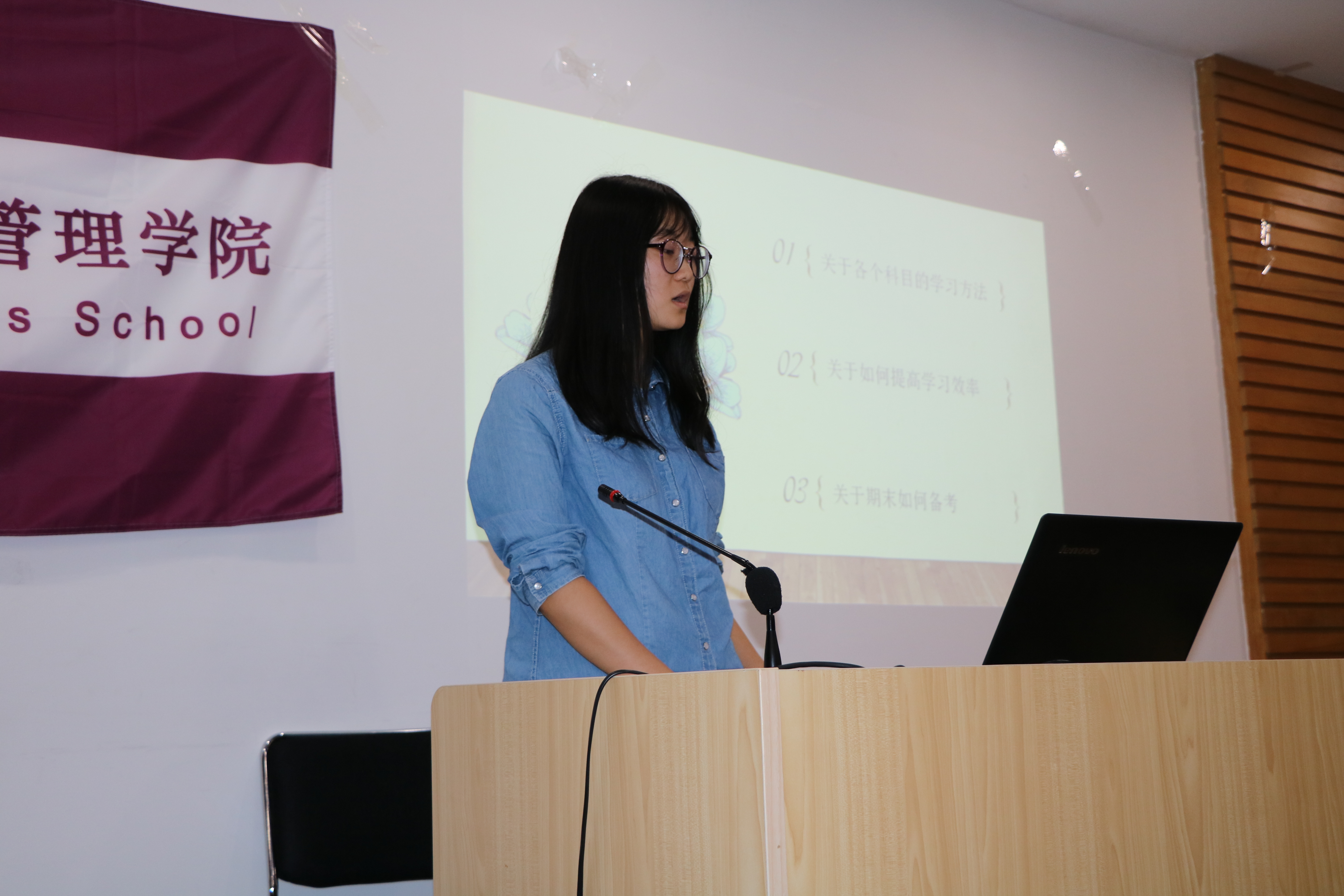 首先为大家分享经验的是14级工管系刘子谞。她主要通过结合自身经历,介绍如何平衡学习与学生工作。她认为,学生工作在扩大人际网络,锻炼意志品质,学习时间管理和做好未来规划方面有着不可估摸的作用。但随着学习压力的日益加重,我们也应该根据自身兴趣和人生方向进行理性取舍。她最后通过引用论语里的“取乎其上,得乎其中;取乎其中,得乎其下;取乎其下,则无所得矣。”激励我们要学会规划,随时为自己设定“小目标”。
