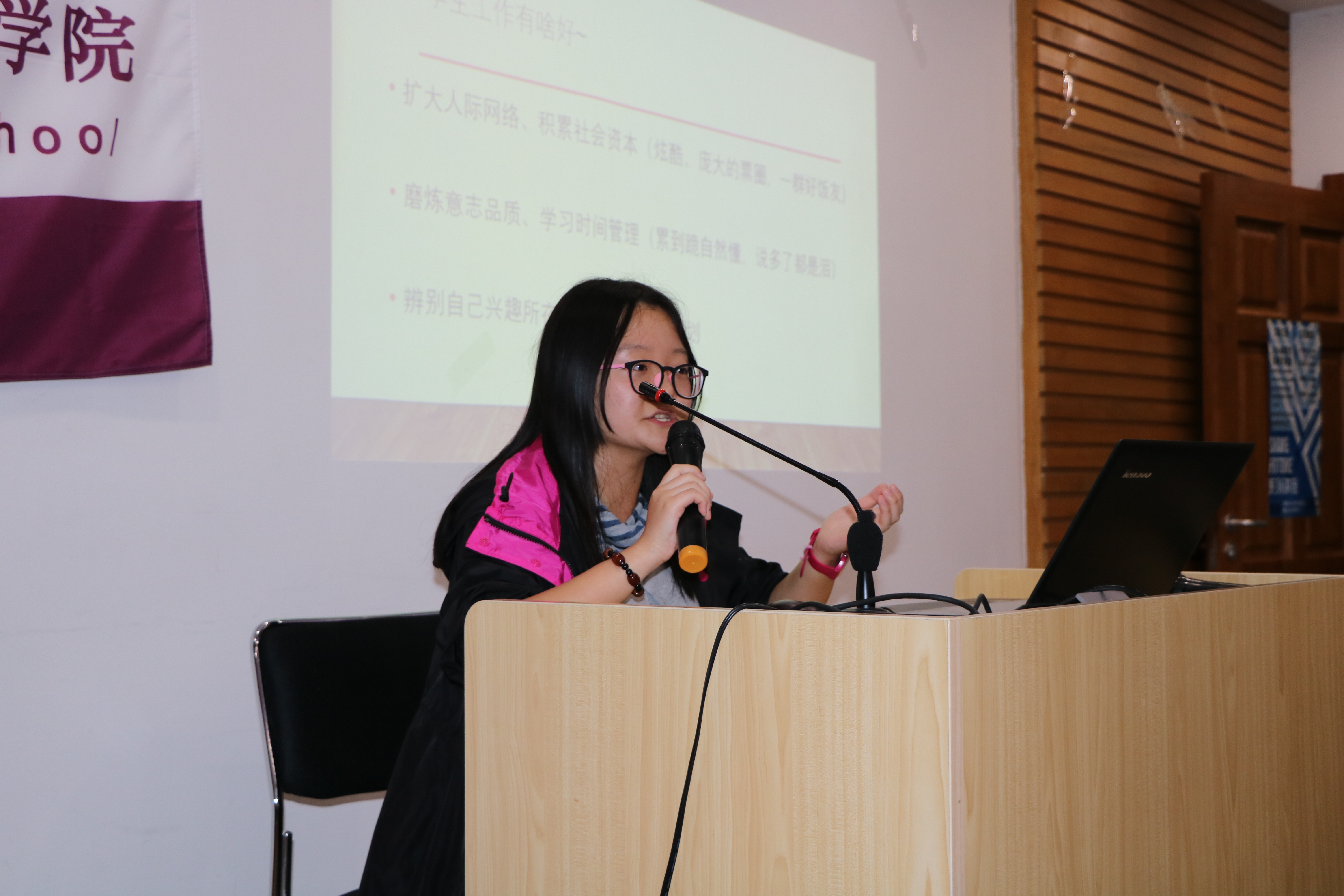 接着,来自14级经济系的侯玉娟在保研,出国和就业方面为大家提出了一些建议。针对大一新生,她提示大家要积极利用图书馆,学长,导师等资源。她提到了一些保研和出国的准备工作和注意事项,着重强调了平时学习成绩的重要性。就业方面,她建议大家要有目标地进行实习,获得职场经验和社交资源。如果对自己未来规划比较迷茫,尽量选择考研,不要急着就业。