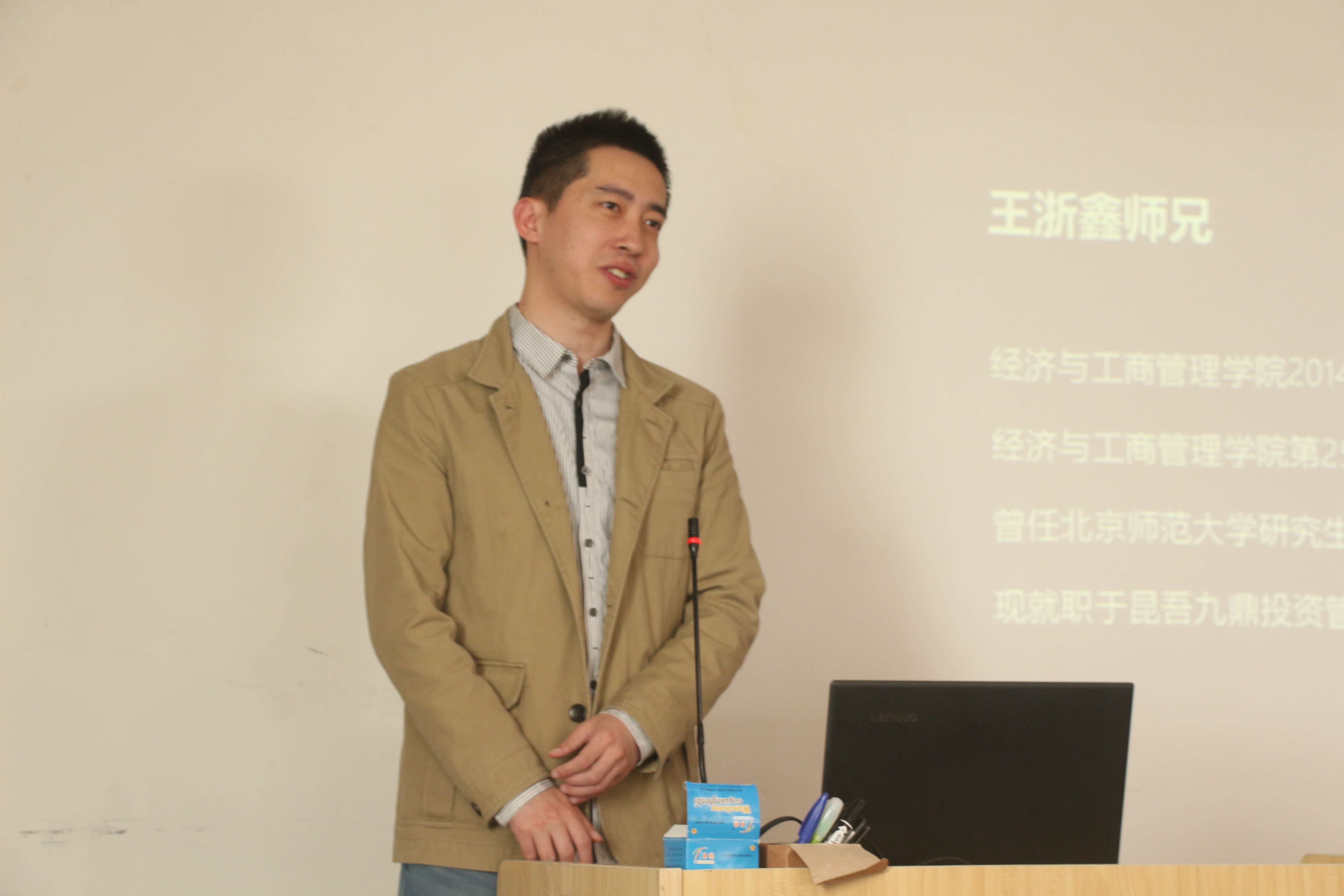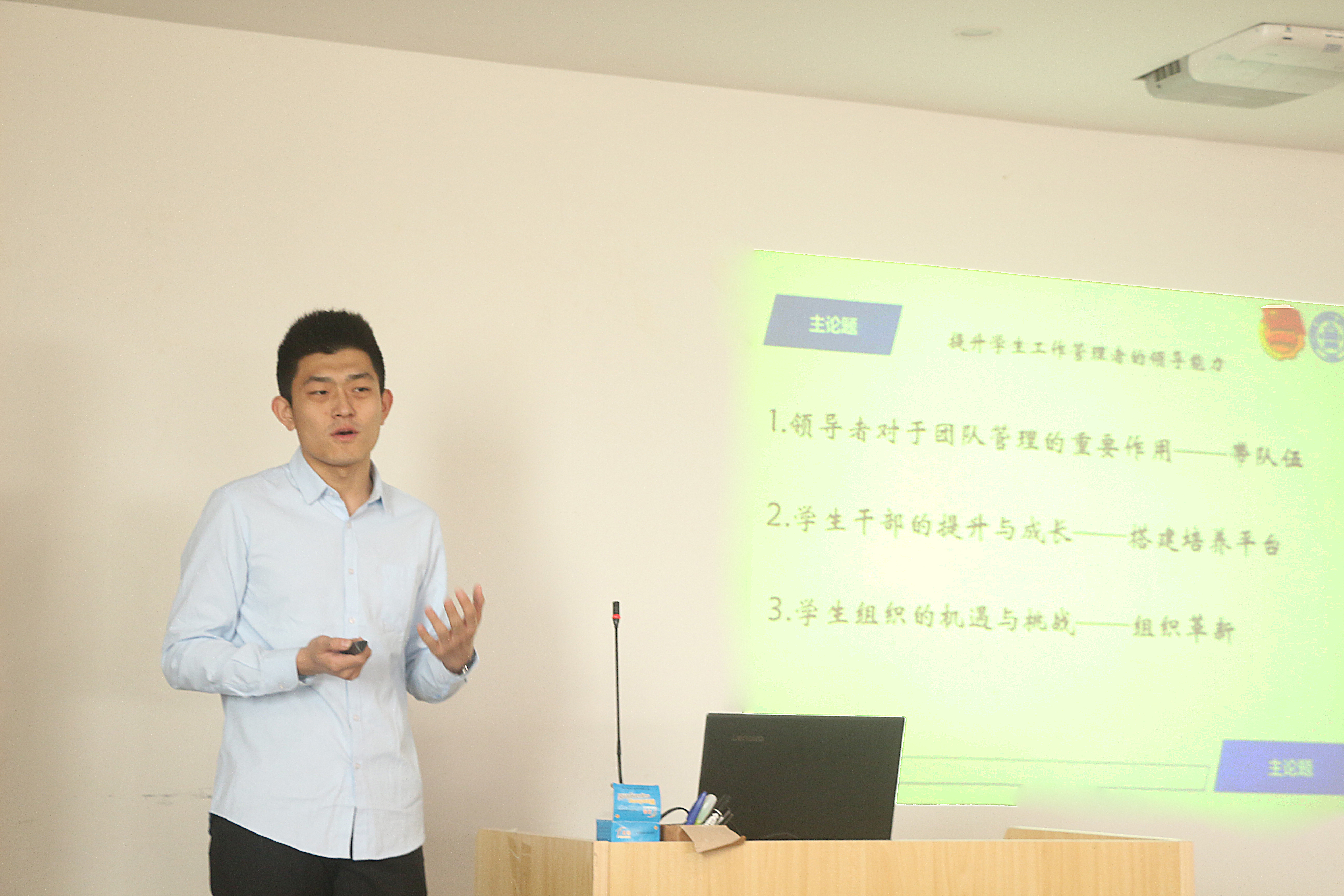 其次,王浙鑫跟我们分享了他的看法。他先介绍了自己,自然亲切的语言很快拉近了与同学们的距离。接着,他从如何培养接班人入手,从亲和力、示范效应等方面讨论各种领导风格的利弊,最后,他结合自己的工作经历,鼓励同学们思考学生工作与职场实际工作的关系。