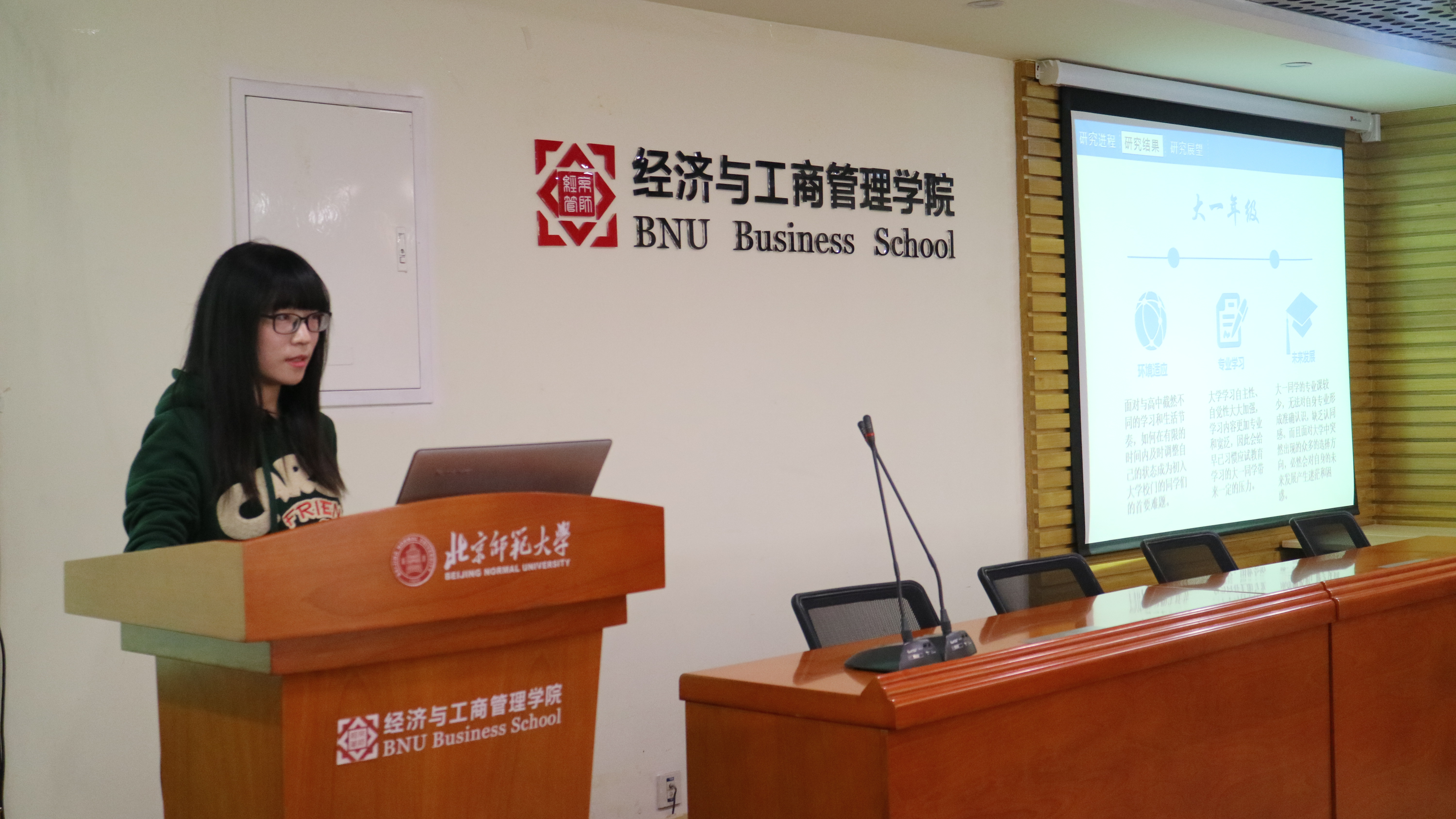 第三位答辩的是王乙婷,研究的课题是大学生心理健康对学习成绩的影响。她首先说明了心理问题现状及研究过程,之后根据调查数据分析指出大学生有学习倦怠感的原因,如大一大二没有明确目标,对自己的专业不感兴趣,对教学体制不满等等。接着给出了调查结论。最后袁博提问并指出了报告存在的问题及建议。