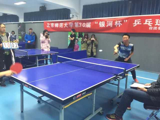 第一局是男单对决。经管的乒乓队员苏远航运球娴熟,乒乓球旋转飞舞,尽显大侠风范!只见他发力使出一招正手攻球使乒乓球飞速飞向对手,对手一时眼花缭乱,我方赢一分!接着,他看准时机,一招推挡使对手猝不及防,再赢一分!可惜,许是我方队员过于紧张,状态不佳,竟落后对手好几分。上半局以6:11收场。中场休息时,观众们围在苏远航身边,为他加油鼓劲,队员们也为他出谋划策。下半局以8:11结束,失分点主要在于打空球和下网。虽然首战失利,但苏远航不放弃任何一球的精神大大鼓舞了队友们,为他喝彩!