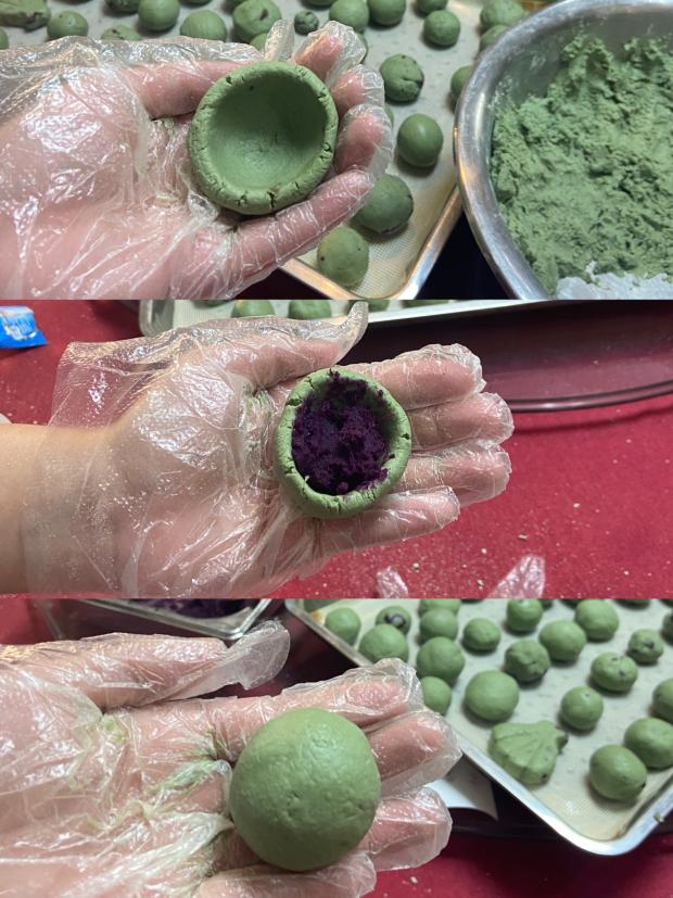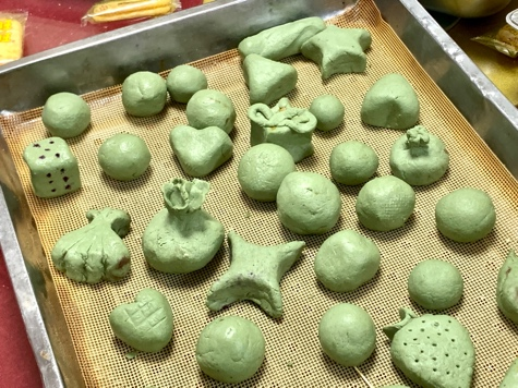 同学们发挥无限的创意,包出了既有混合口味,又有别致外形的青团——爱心、星星、草莓、福袋、糖葫芦串、骰子、饺子等等~~只有想不到,没有做不到!