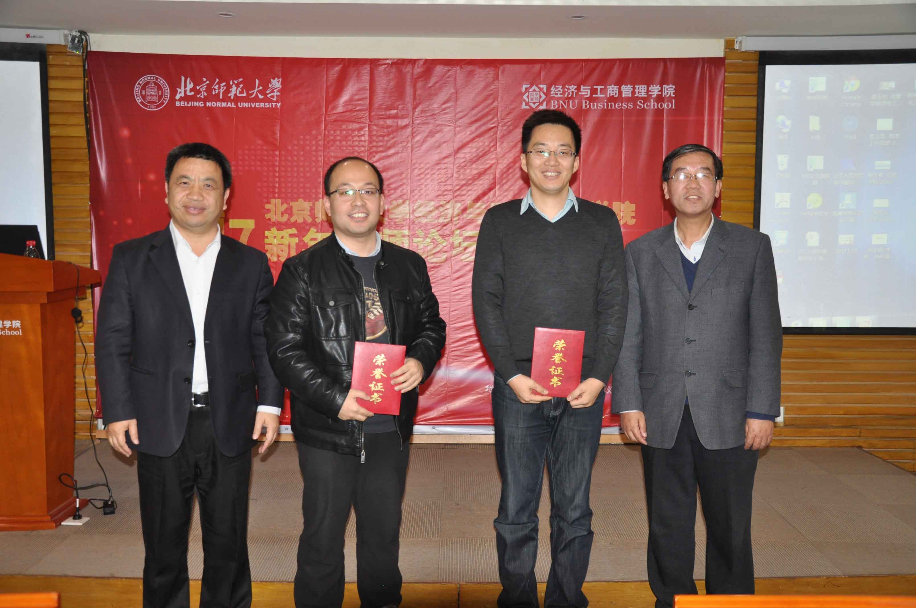 图2 院长赖德胜教授和学术委员会主席李实教授为蔡宏波、魏浩老师颁发证书