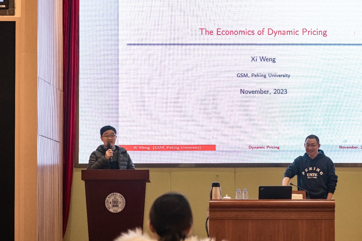 2023年11月17日晚,潮人论坛 京师经管名家讲坛(第120期)在昌平校园教学综合楼2号报告厅举行,北京大学光华管理学院应用经济系长聘教授、教育部青年长江学者、国家自科基金杰出青年科学基金获得者翁翕教授主讲。潮人论坛 副院长张平淡教授、经济系主任许敏波副教授、经济系朱敏副教授和昌平校园博士生参会交流。讲座由许敏波负责主持,并通过长江雨课堂在线直播。