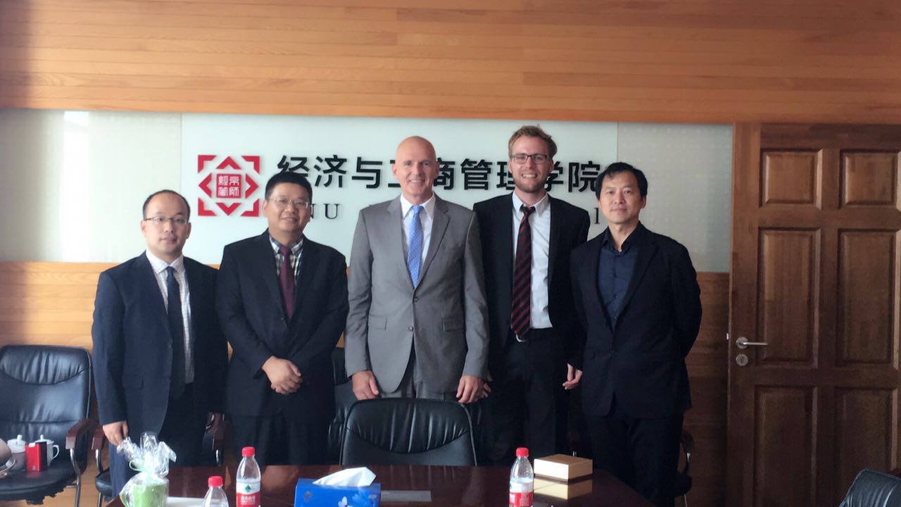 张平淡副院长对Harald Von Korflesch副校长一行表示欢迎,他介绍了学院的基本情况,特别是潮人论坛 在教师互访、学生交流,以及国际科研平台等方面的发展近况。Harald Von Korflesch表示很高兴首次到访北京就来到潮人论坛 ,随后他介绍了科布伦茨-兰道大学的基本情况,以及ZIFET机构的组织框架和运作。双方重点探讨了有关双硕士学位合作项目以及短期游学项目,并希望借此机会积极推动双方的合作与交流,使两校更多的教师和学生从中受益。