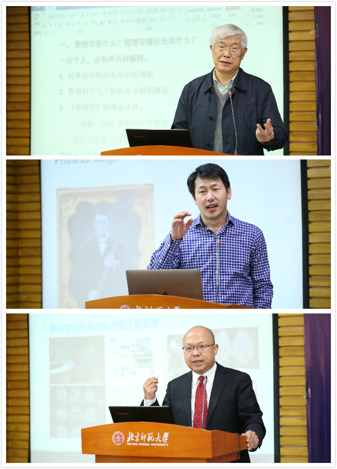 的薛贵教授和崔学刚教授。马庆国教授发表了《神经科学怎样改变管理学》的主题演讲,在梳理管理学理论历史脉络的基础上,用生动的学术案例展示了神经科学带给管理学理论带来的影响和改变,强调了随着技术的进步,生产过程中以体力劳动为主逐渐变为以脑力劳动为主,运用神经科学建立针对脑力劳动的管理理论是管理学理论的重要发展方向,中国管理学者和世界管理学者面临同样的难得历史机遇。薛贵教授作了题为《MPFC and economic decision making(大脑前部内侧前额叶皮层与经济决策行为)》的报告,分享了大脑前部内侧前额叶皮层对经济决策的影响的系列研究,展示了神经科学领域的一些测量技术和方法及其应用于经济学和管理学研究的成功尝试。崔学刚教授作了题为《神经会计学研究:回顾与展望》的演讲,系统回顾了神经会计研究产生与发展背景,研究特征与范式,并通过具体的研究案例介绍了研究的实施方法,最后对神经会计研究策略和研究方向进行了展望,指出只有通过学科还原与学科综合,当且仅当建立起独立的神经会计学概念体系和实验方法体系,神经会计学才能作为一个学科建立起来。