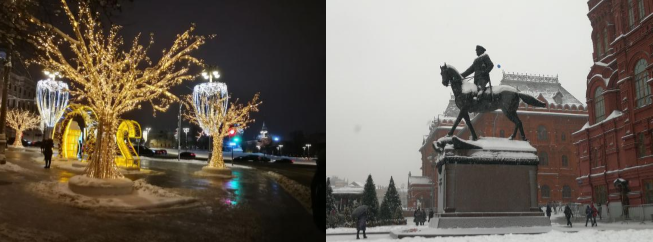 初到莫斯科,原本预想会立即接到案例任务,心里难免有些七上八下。意料之外的是,迎接我们的是趣味十足的文化项目。当地的大学生陪伴着我们领略莫斯科的城市风光、人文风情。他们向我们讲述自己对画廊所陈列油画的独到看法,在大雪中带领我们远足至红场、克里姆林宫,感受当地人们对新年的期许与憧憬。其实不只是红场,远足行程中街道普通的建筑物和灯饰都令我们惊叹这座城市的独特之处。