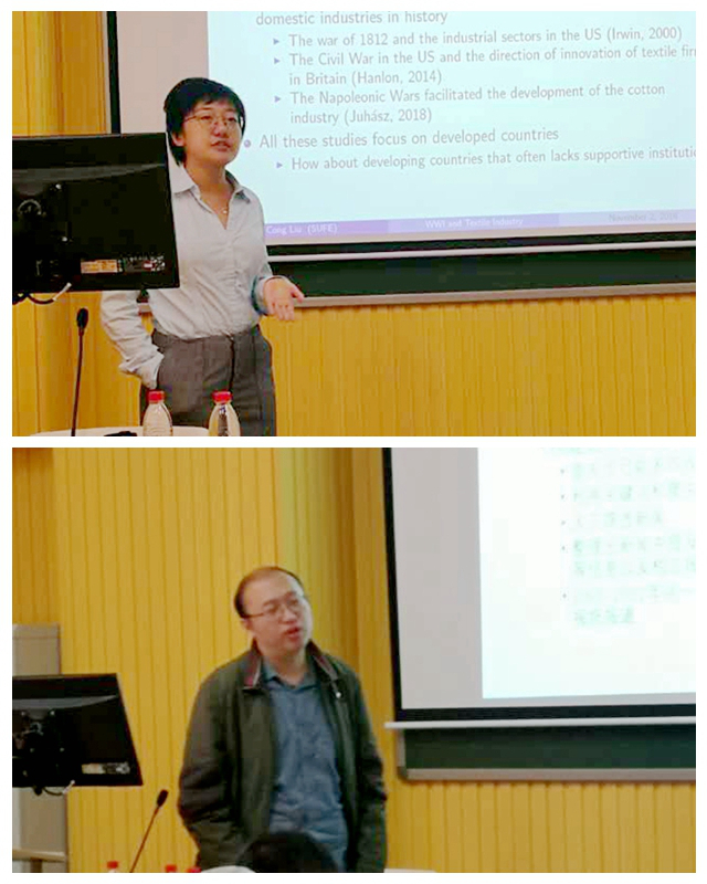 上海财经大学经济学院助理教授刘丛讲座的主题是Was the world’s Trouble China’s Opportunity?The Effects on World War I on Chinese Textile Industry,主要研究内容是第一次世界大战带来的国际贸易波动对中国棉纱产业发展的影响。通过构建1907-1925年间包含棉纱企业、进出口贸易及当地特征等信息的县级面板数据来探析该时期贸易冲击的影响。研究使用了DID的方法进行时间和空间差分,另外,通过GS进行路网构建,将各个县域与通商口岸的距离作为重要变量纳入模型。结果发现,贸易冲击对中国的棉纱产业有显著的影响,并且这种影响随着县域与通商口岸距离的增加而降低。参与讲座的老师和同学们还就这一时期政府税收是否增加,政府对棉花种植与生产的政策及外资企业进入等因素及其可能带来的影响与发言人进行了热烈讨论。