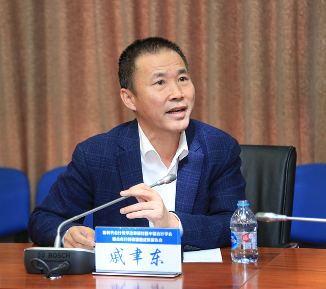 第三位汇报人是来自中央财经大学的赵雪媛教授,她汇报的题目为《会计行业技术技能积累与教学转化研究——以会计本科教学资源(含实训)建设为例》。赵雪媛教授提出,教学资源的构建是当前会计教学改革的核心。她立足于当前会计教育供需差距不断扩大的背景,从实现教育强国的战略要求以及大智移云的时代机遇出发,提出了现阶段大学会计教育改进的具体目标,研究了在大智移云环境下会计行业技术技能积累和教学转化的方法途径以及大学本科教学资源建设的思路。最后,赵雪媛教授分享了中财会计学院已有会计教改的成果,通过实例展示了这一研究的应用情况。