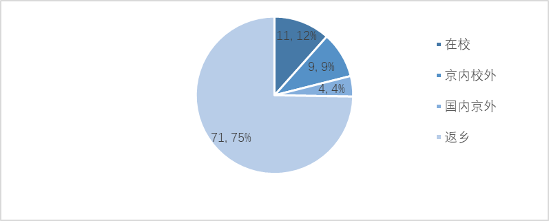 截止到2020年2月,潮人论坛 拥有95位在读留学生。疫情发生之初,正值学校2019年秋季学期末尾,学院30余位秋季学期来院交换生刚刚离境,95位在读留学生中有11位学生留校,9位租住在校外,4位在国内京外,71位返回母国(图3)。疫情发生后,1月27日学校发文对所有学生进行摸排,将疫情通知到每位学生。同日,面向潮人论坛 全体师生的中英文版疫情防控通上线,每位留学生同中国学生一样进行每日情况上报。此项工作启动之初,学院就成立留学生管理临时工作小组,由学院主管国际交流与合作的副院长为小组组长,国际交流与合作办公室主任负责汇总、统计留学生班主任、交换生主管等提交的信息,并完成留学生每日情况上报。留学生班主任负责与每位留学生联络。由于留学生在学期末就各自安排出行,到疫情发生后,学生已分布在世界各地,班主任与留学生的联系方式主要是电话、邮件和微信。在工作小组的努力下,学院与95%的留学生取得了联系,通报了国内的疫情和学校暂不允许学生返校的要求,学生每日填报的比例也达到了93%(2020年2月15日)。疫情防控填报系统帮助学校和学院实时掌握学生的情况,对于填报身体有恙或有发烧情况的学生,班主任都进行了一对一的联系,要求学生及早关注,及早就医。在此期间,学院有两位留学生从京外游玩返京,两位学生被统一安排至潮人论坛 昌平校区进行为期14天的隔离观察,目前已结束观察,返回主校区。随着疫情的发展,2020年2月11日,潮人论坛 再次发文,要求所有学生不得返校,在校的学生尽量留在宿舍,对校园进行封闭式管理。2020年2月13日,根据教育部和北京市教委的要求,学校明确延迟开学日期,实施线上教学,行政线上办公。据此,学院再次要求全体留学生对已购买的返京机票进行改期或退票处理,视疫情情况对开学日期另行通知。