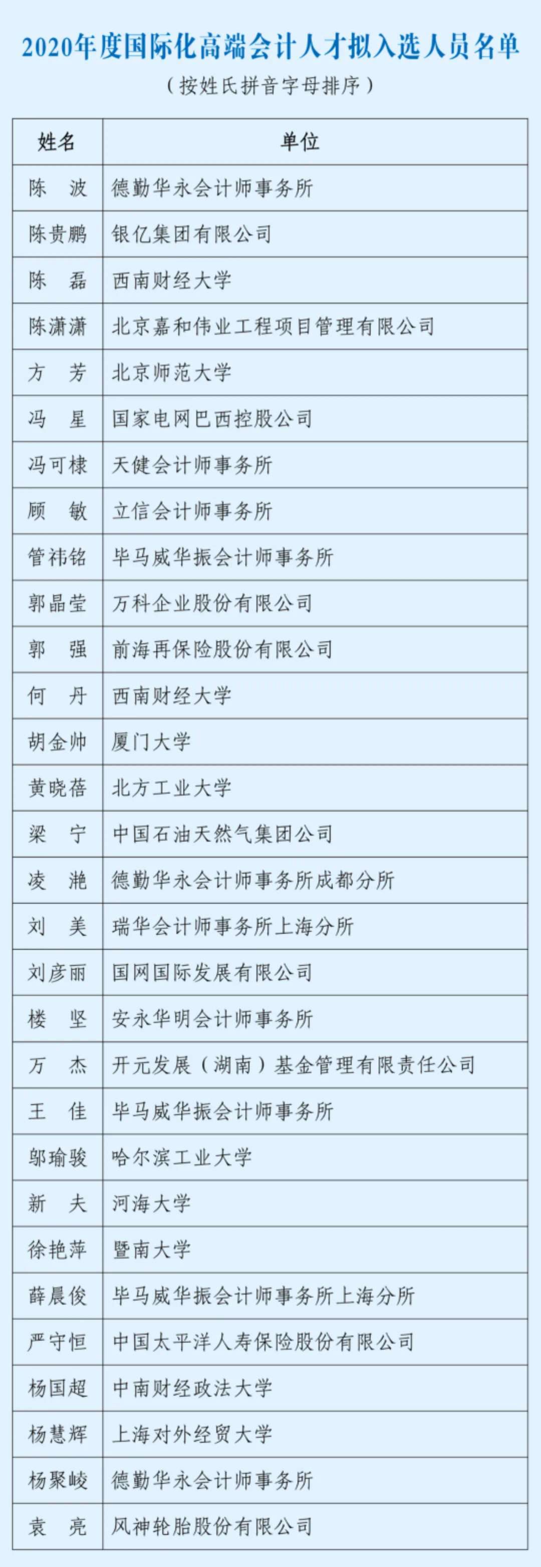 国际化高端会计人才的选拔工作包括前期成果审核、笔试、面试等环节,财政部会计司组建专家评审委员会,进行材料测评、考试命题、阅卷及面试等工作。来自全国各行各业的企事业单位会计负责人、会计师事务所专家与高等院校的会计学专业教师等百余人在前期成果审核通过后进入笔试和面试等环节,最终入选30位。入选名单如图所示。