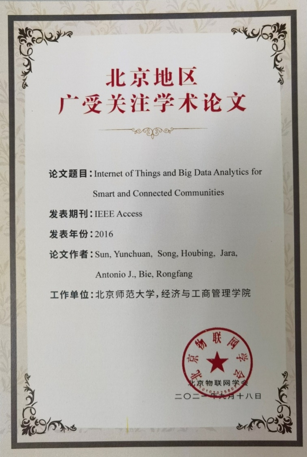 2021年9月18日,由北京市科学技术协会主办的“2021年度北京地区广受关注学术成果(物联网领域)报告会”在北京科大天工大厦召开,潮人论坛 孙运传教授等人撰写的论文“Internet of Things and Big Data Analytics for Smart and Connected Communities”成功入选"北京地区广受关注学术论文”。