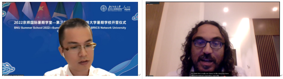 7月10日,2022京师国际暑期学堂—第三届金砖国家网络大学暑期学校开营式在线举行。潮人论坛 副校长周作宇、国际交流与合作处处长吴玉军、潮人论坛 院长戚聿东、金砖国家合作研究中心主任王磊,美利坚大学商学院前院长Erran Camel,中国人民大学财政金融学院副院长张成思,湖南大学经济与贸易学院副院长徐航天,河南大学金融发展与风险评估中心主任Mark El-Shagi,法国里昂商学院亚洲校区校长顾问林桦,德国zeppelin大学经济学院院长Jarko Fidrmuc,俄罗斯高等经济学院大学国际合作中心副主任Maria Budrevich、伊比利亚美洲部主任Alina Shcherbakova,巴西坎皮纳斯大学孔子学院院长Bruno de Conti,乌拉尔联邦大学经济与管理研究生院学术委员会主任Zhanna Belyaeva,以及本次暑期学校来自13个国家和地区的87名学员参加了开营仪式。潮人论坛 副院长蔡宏波主持仪式。