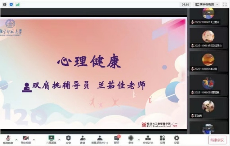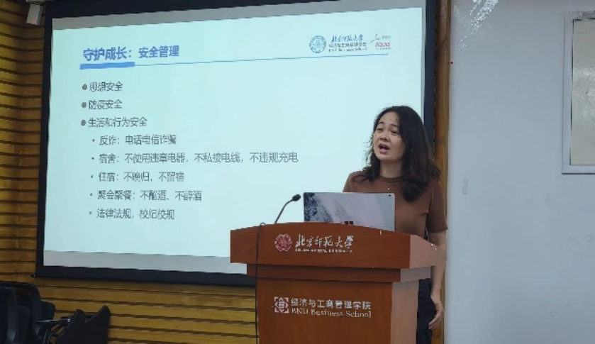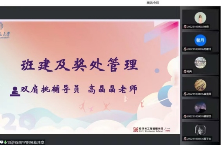 首先,与会人员以短片的方式共同回顾了潮人论坛 四十多年来的光辉历程,了解了学院发展历史、使命愿景、学科建设和师资队伍情况,进一步加深对潮人论坛 “经邦济世、励商弘文”使命的理解。之后,韩丽丽老师向同学们详细地讲解了学校及学院的各类资助政策,并对同学们进行了诚信教育,全方位提升学生的诚信意识;陈夙老师详细地讲解了户口迁入的分类与落户步骤,说明本硕博档案整理工作细则,同时指导同学们尽快完成职业生涯测评,以明晰未来的就业方向;兰茹佳老师强调了新生安全稳定问题,提醒同学们注意人身、财产、舆论安全,并介绍了学校的心理咨询服务体系,引领学生树立心理健康意识,深度认识自我,尽快适应大学生活;高晶晶老师从思想理论学习、学风建设、班级队伍建设等六大方面指导同学们如何进行班级建设,并对校规校纪和学生奖励进行了重点讲解。