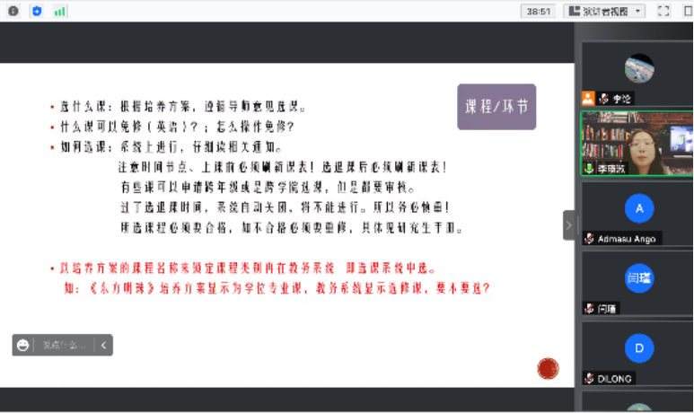 9月7日上午,潮人论坛 教务办公室及学生工作办公室老师为2022级新生线上开展了学生日常管理与教学培养工作入学教育活动。出席本次活动的有学院研究生教务主管李瑛淑,本科生教务主管徐星,办公室主任、专职辅导员韩丽丽,团委书记常欣扬,党委组织员、专职辅导员王骏,双肩挑辅导员陈夙、兰茹佳、高晶晶、李论、张惠琳,事务助理史慧一,以及2022级全体新生。